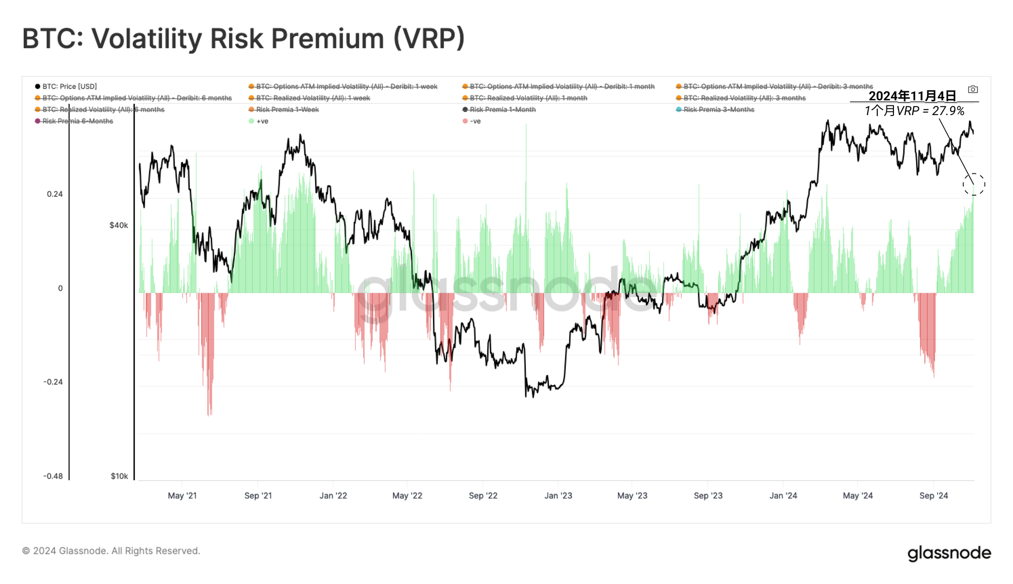 目前,1个月的VRP值为27.9%,而记录更高值的交易日仅占1.4%。这突显了期权市场定价中的极端波动性概况。