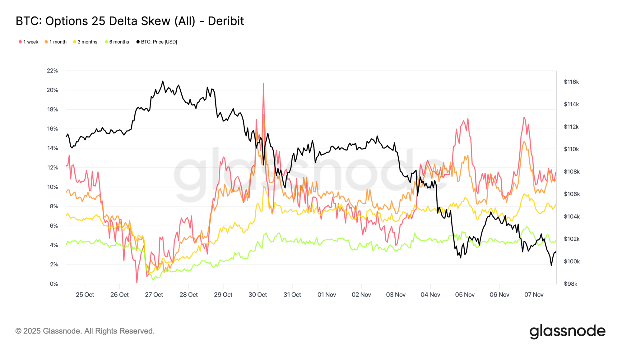 链下指标也回荡着相同的谨慎基调。ETF 资金流出、低迷的资金费率以及疲弱的未平仓量,都指向投机活动的低参与度,而期权交易者仍偏爱在 10 万美元附近进行下行保护。