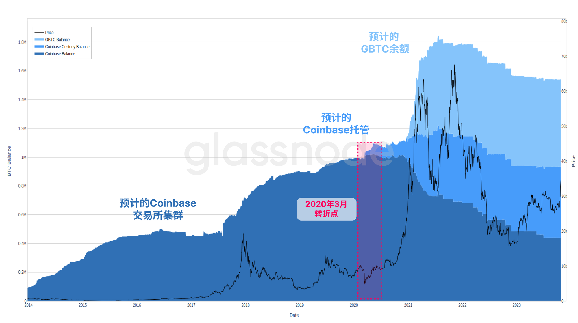 其中一个重要的细微差别是机构级托管人和GBTC等ETF式产品的作用(这对未来的现货 ETF工具是一个有用的参考)。下图显示了我们对Coinbase交易所、Coinbase托管和GBTC集群的链上总量的最佳估计。