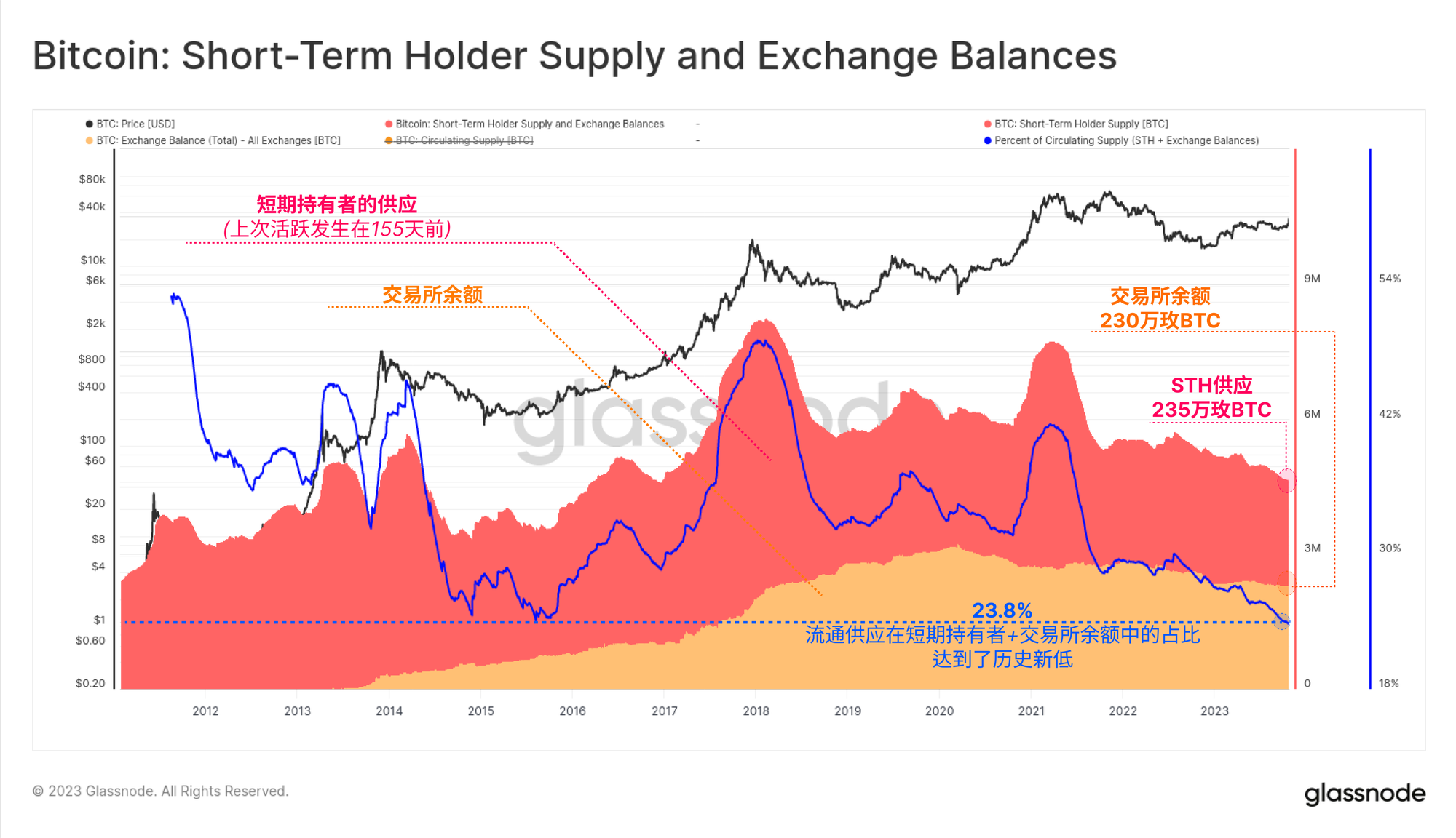 如果我们比较一下短期持有者供应量和交易所余额,就会发现它们的规模相似,都在 230万玫比特币左右。这两种 "可用供应量 "加在一起相当于流通供应量的23.8%,目前处于历史最低水平。