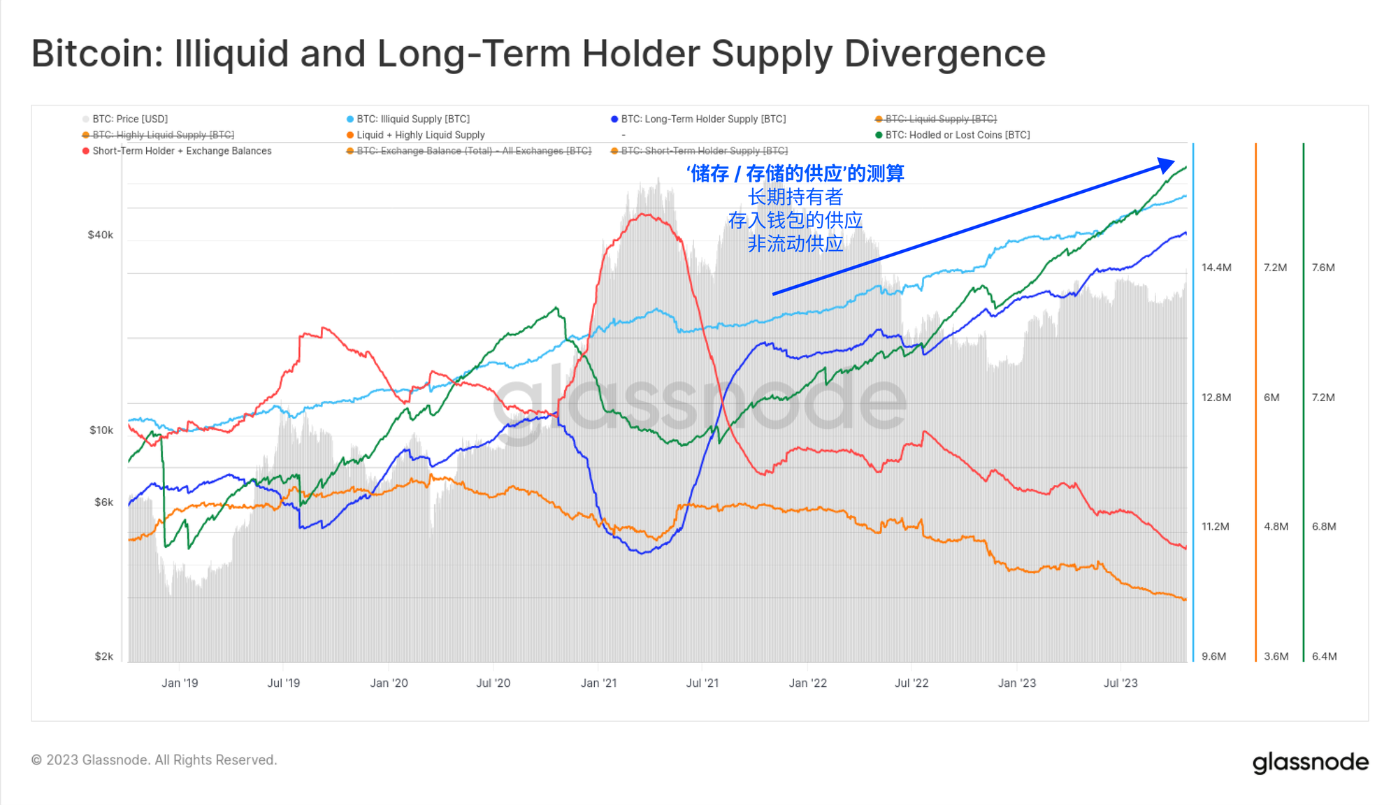 - 存储供应(深度的囤币者和丢失的供应,参见Cointime经济学,绿色)