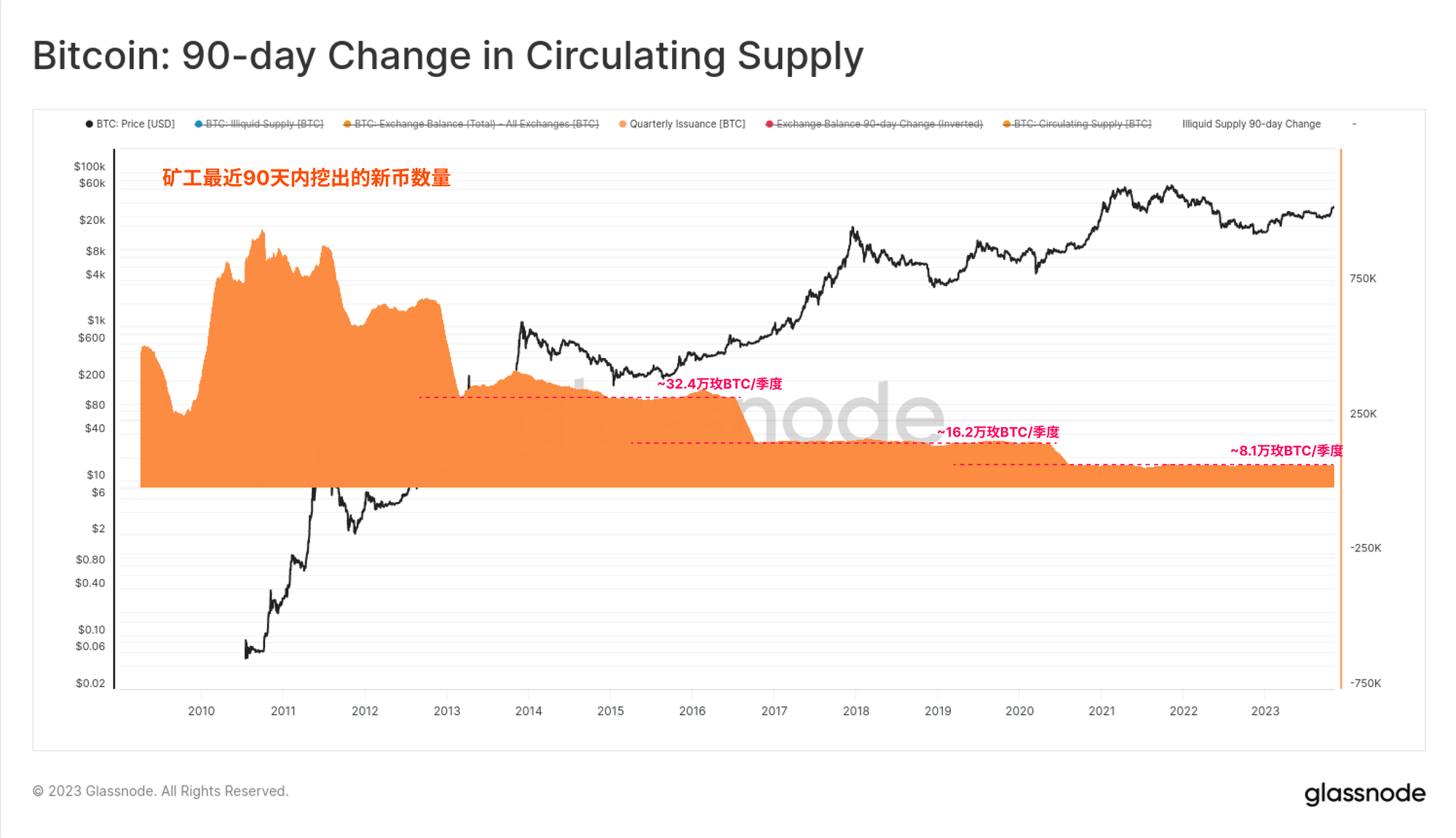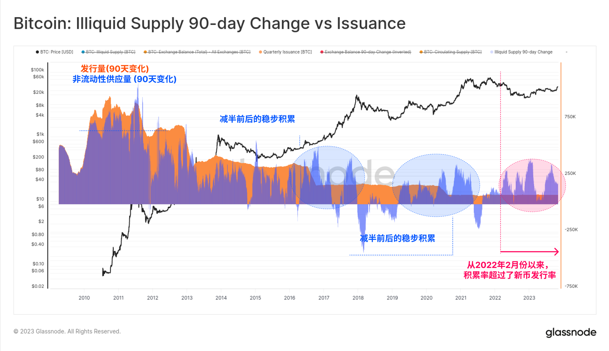如果我们叠加非流动性供应的90天变化,就会发现在之前的所有减半事件中,非流动性余额都持续上升。这表明,在减半之前和减半过程中,投资者买方往往会加大投资力度,在减半前后往往会大大超过比特币发行速度。