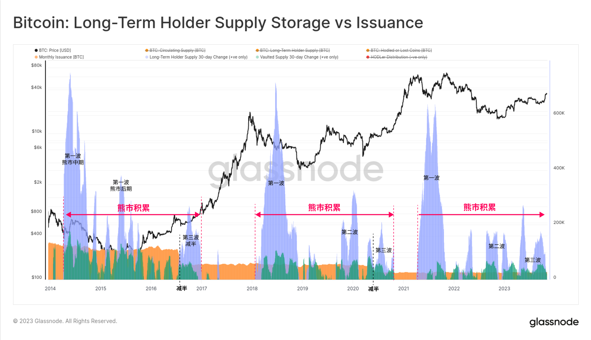 通过使用投资者持有时间作为输入的“存储供应”视角,我们看到长期持有者(蓝色)和金库存储(绿色)展现出类似的积累模式。有趣的是,投资者的这种行为似乎分为三个阶段: