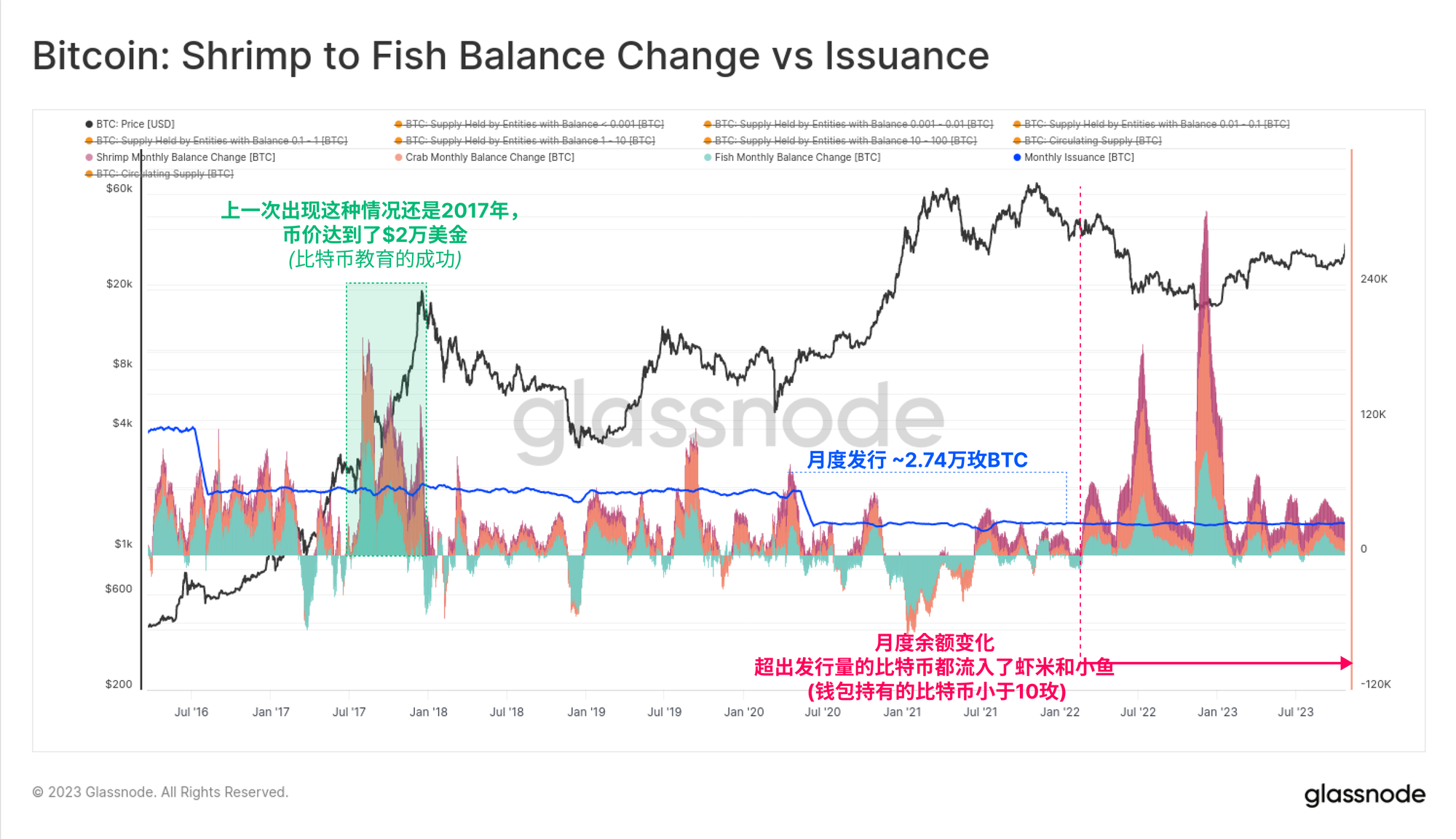 累积率也可以通过钱包大小启发式方法来评估,这张图表考虑了所有持有少于100比特币的实体。这些虾米(<1BTC)、蟹类(1到10BTC)和鱼类(10到100BTC)覆盖了从零售到高净值个人的广泛投资者群体。