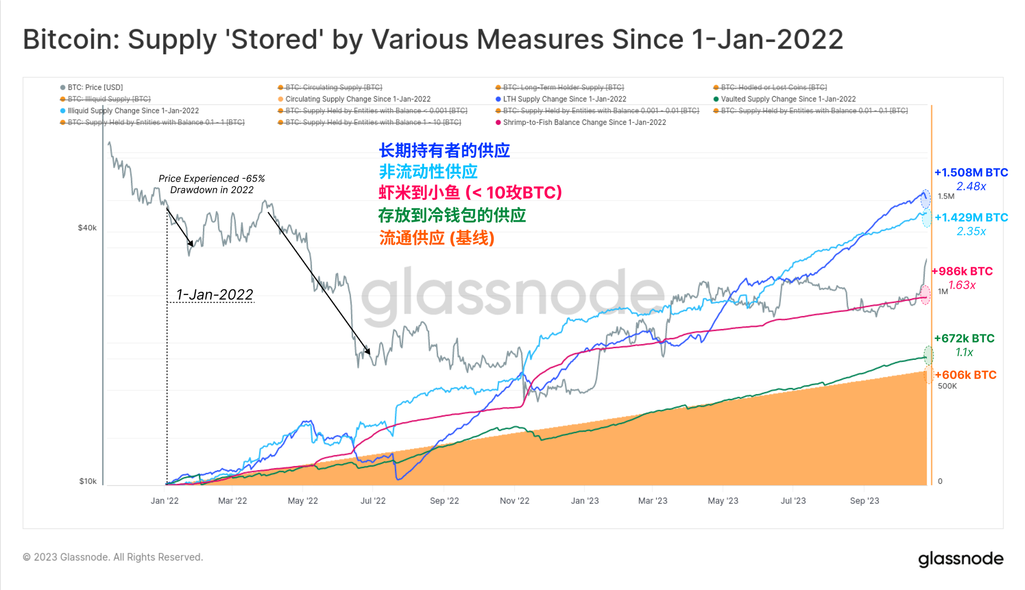 总结来说,下面的图表显示了自2022年1月1日以来这些不同“存储”供应指标的净余额变化。我们使用流通供应量的变化(橙色)作为基准,可以看到投资者的累积率从1.1倍到几乎2.5倍新发行量不等。