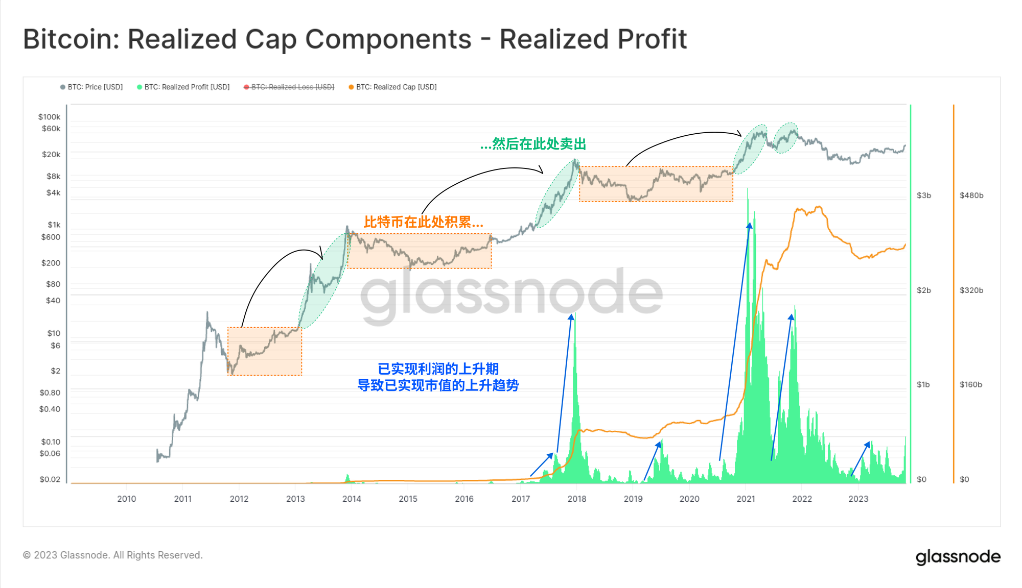 在行为层面上,比特币的长期投资者倾向于低买高卖,这一过程实现了利润,并将比特币的价值从低成本基础重估到高成本基础。2018年以6000美元收购的一枚比特币,到 2021年以6万美元的价格出售,需要多900%的资金流入,才能获得相同的比特币数量。