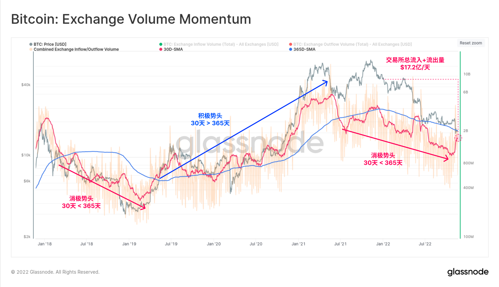 从历史上看,月平均交易量超过年平均交易量的时期标志着积极的市场势头,因为有更多的比特币交易量转手。在目前的市场上,交易所流入和流出量的总和必须达到并维持在21.5亿美元以上的水平,才标志着积极势头。