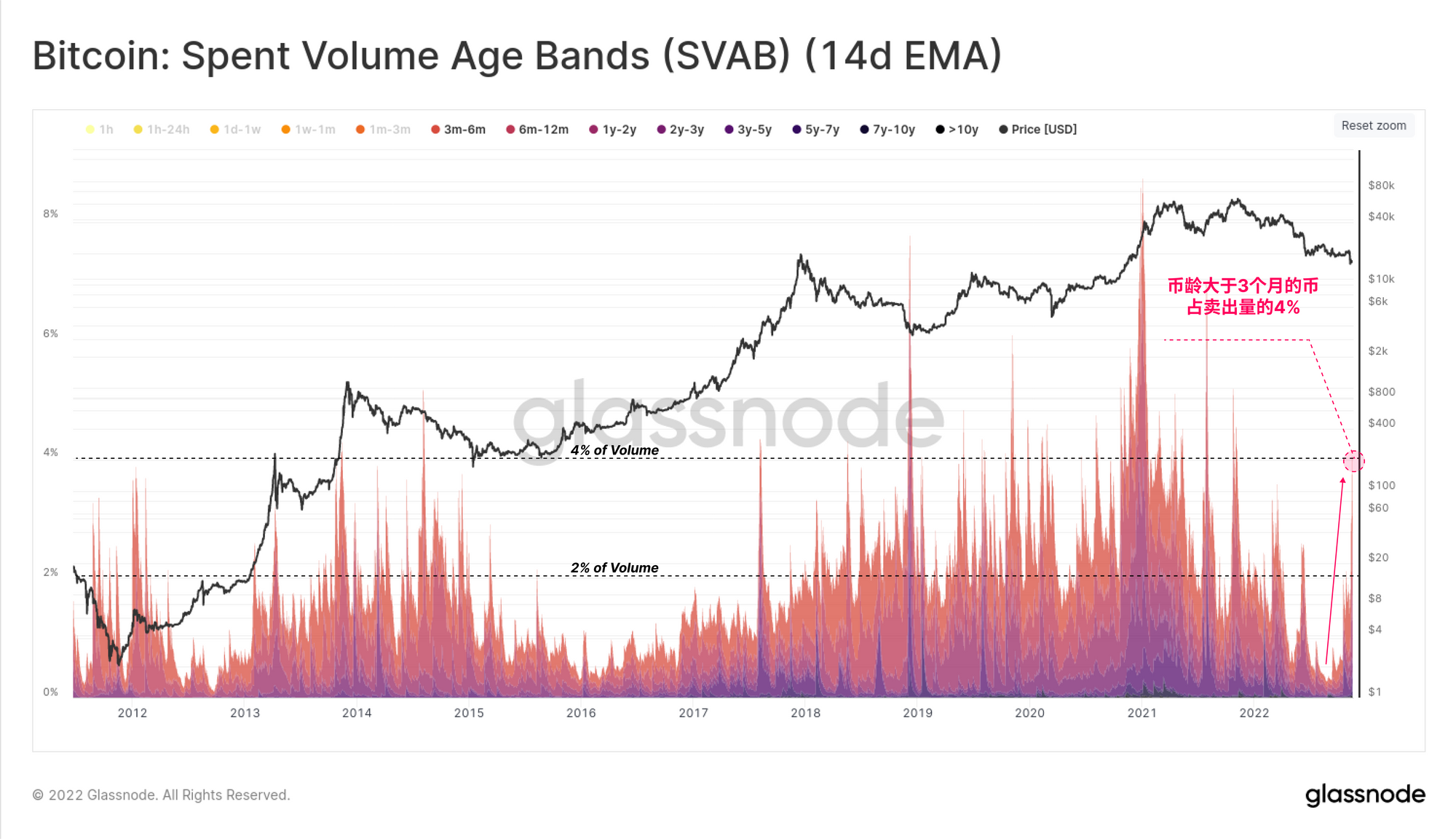 卖出量年龄段(SVAB)指标显示,本周所有卖出量的4%以上来自币龄在3个月以上的比特币,这是2022年的最高水平。这一相对幅度与历史上一些最大的情况相吻合,通常在投降事件和大范围的恐慌事件中出现。