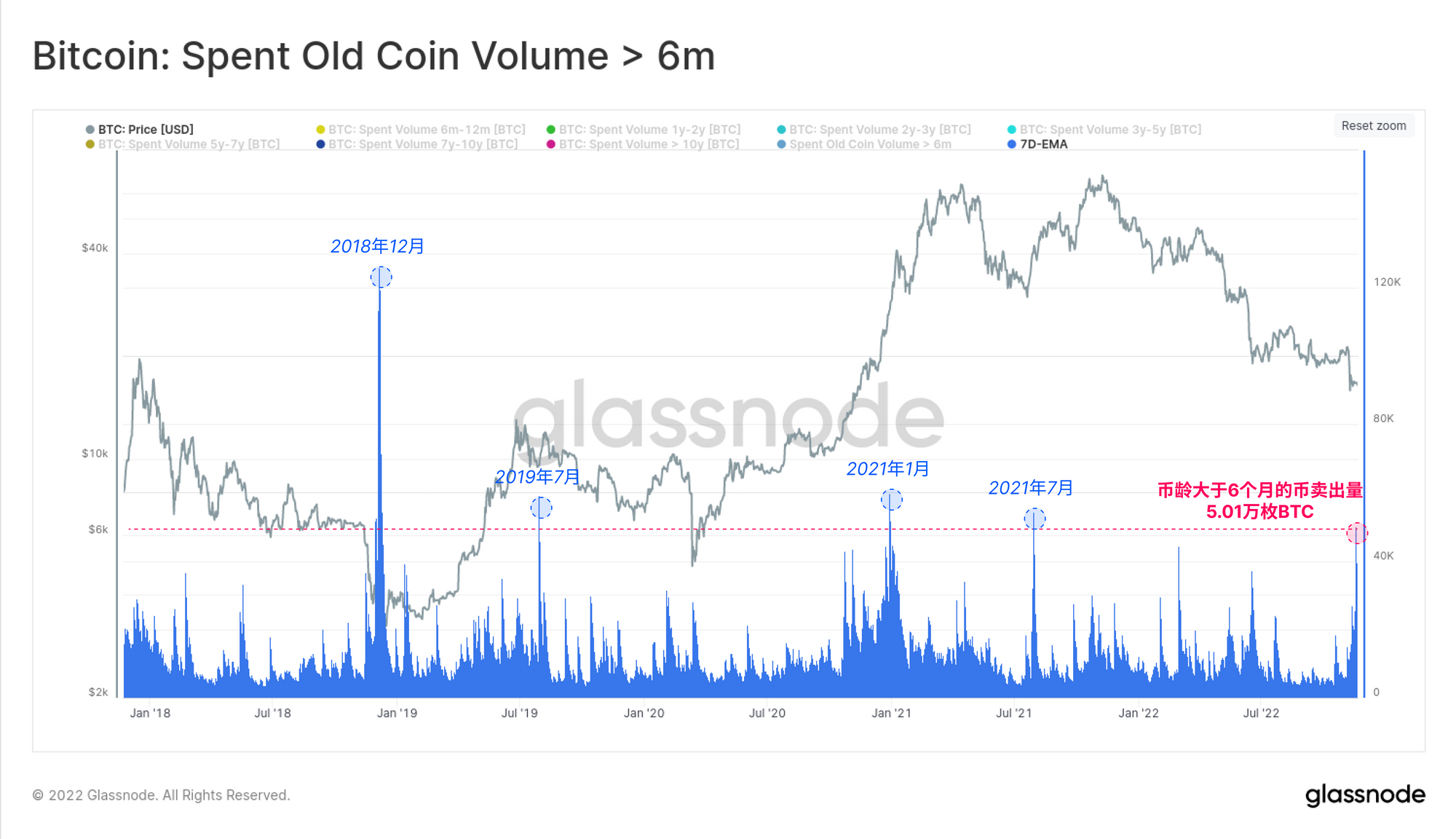 6个月以上的比特币卖出量也创下了过去5年的第五高值。仅在11月17日,就有超过13.06万枚币龄在6个月以上的比特币被卖出,现在7天的平均数是每天5.01万枚比特币。