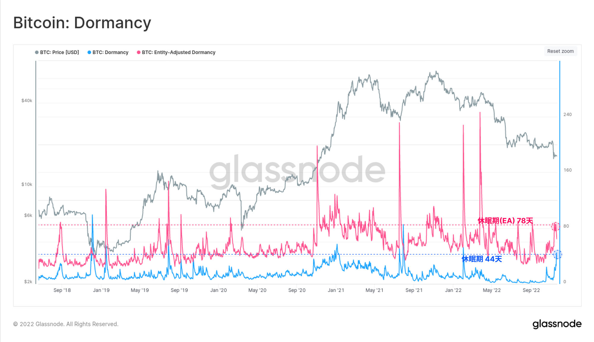 • 🔵休眠期:已经回升到44天,并显示了整个市场上每枚被卖出比特币的平均年龄。