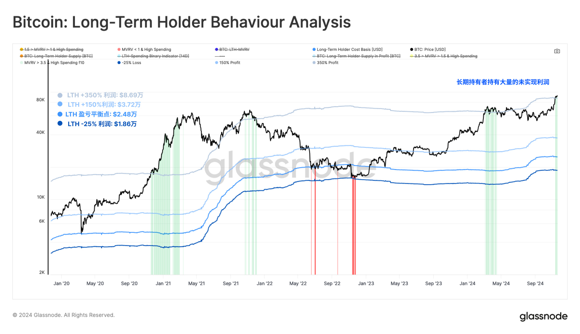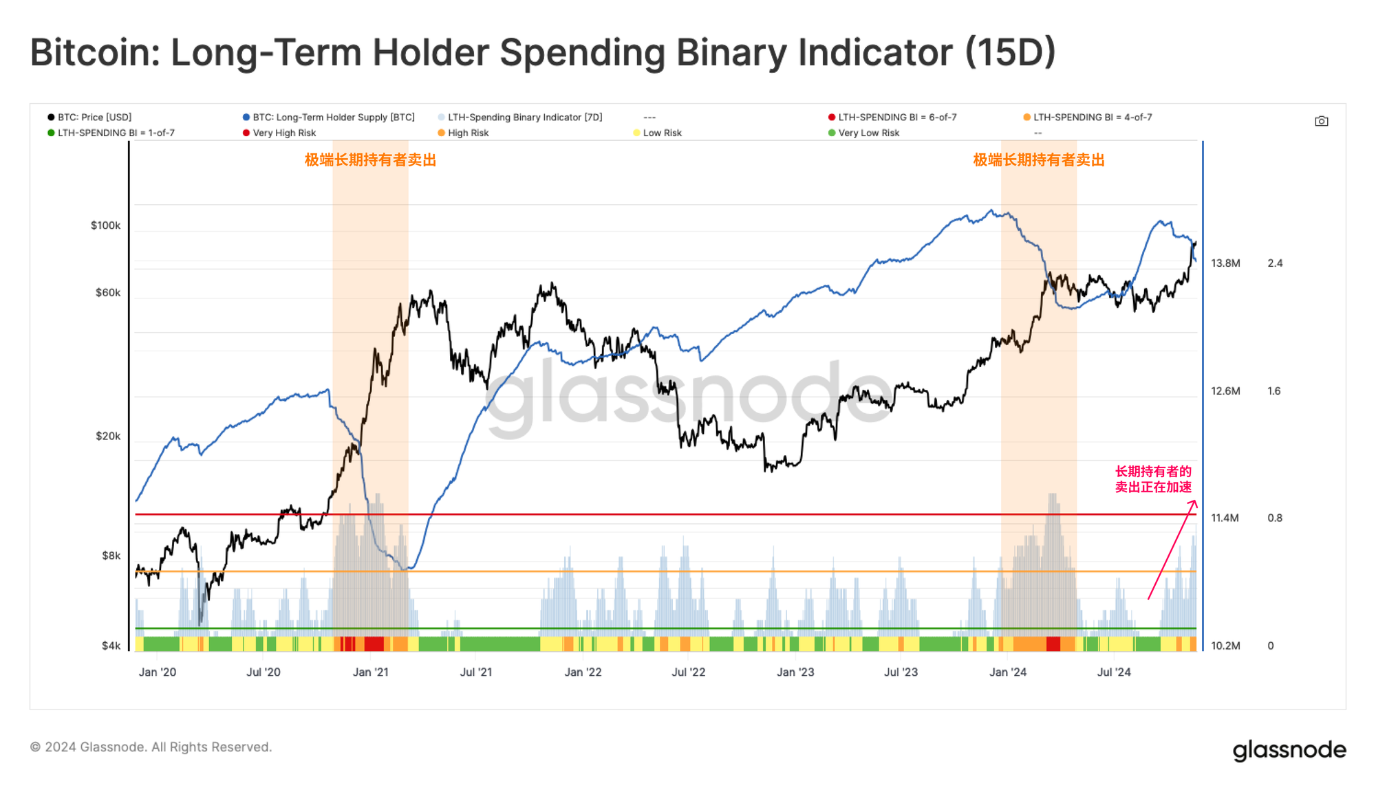 在市场周期的狂热阶段,长期投资者的行为变得尤为关键。长期持有者(LTHs)控制着相当大比例的供应量,他们的卖出动态可以显著影响市场的稳定性,并最终促成局部或宏观顶部的形成。