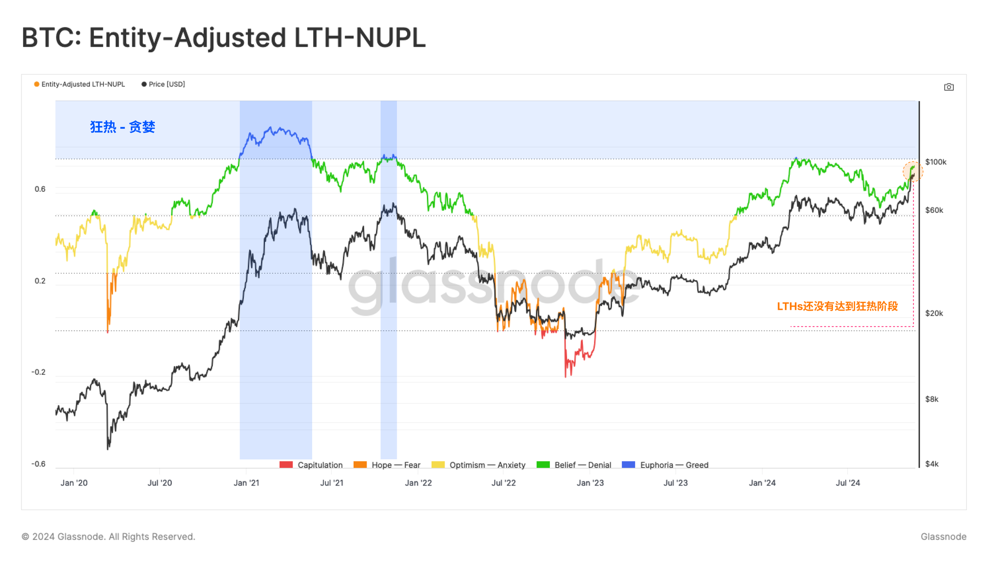 我们可以通过NUPL指标评估长期持有者(LTHs)的账面收益。目前,NUPL值为0.72,略低于“信念🟢到狂热🔵”阈值的0.75。尽管价格大幅上涨,但与之前周期的顶部相比,这些投资者的情绪仍然较为克制,这表明市场可能还有进一步增长的空间。