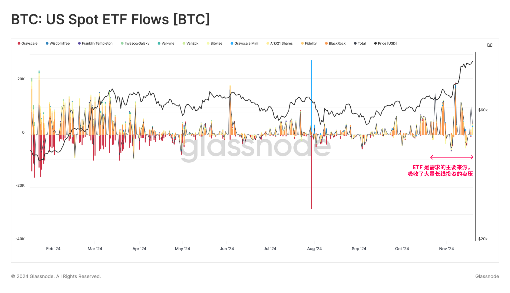 接下来,我们将重点关注机构买家,尤其是通过美国现货ETF对市场的影响。ETF在过去几周内成为需求的主要来源,吸收了长期持有者大部分的卖压。这一动态突显了机构需求在塑造现代比特币市场结构中的日益重要作用。