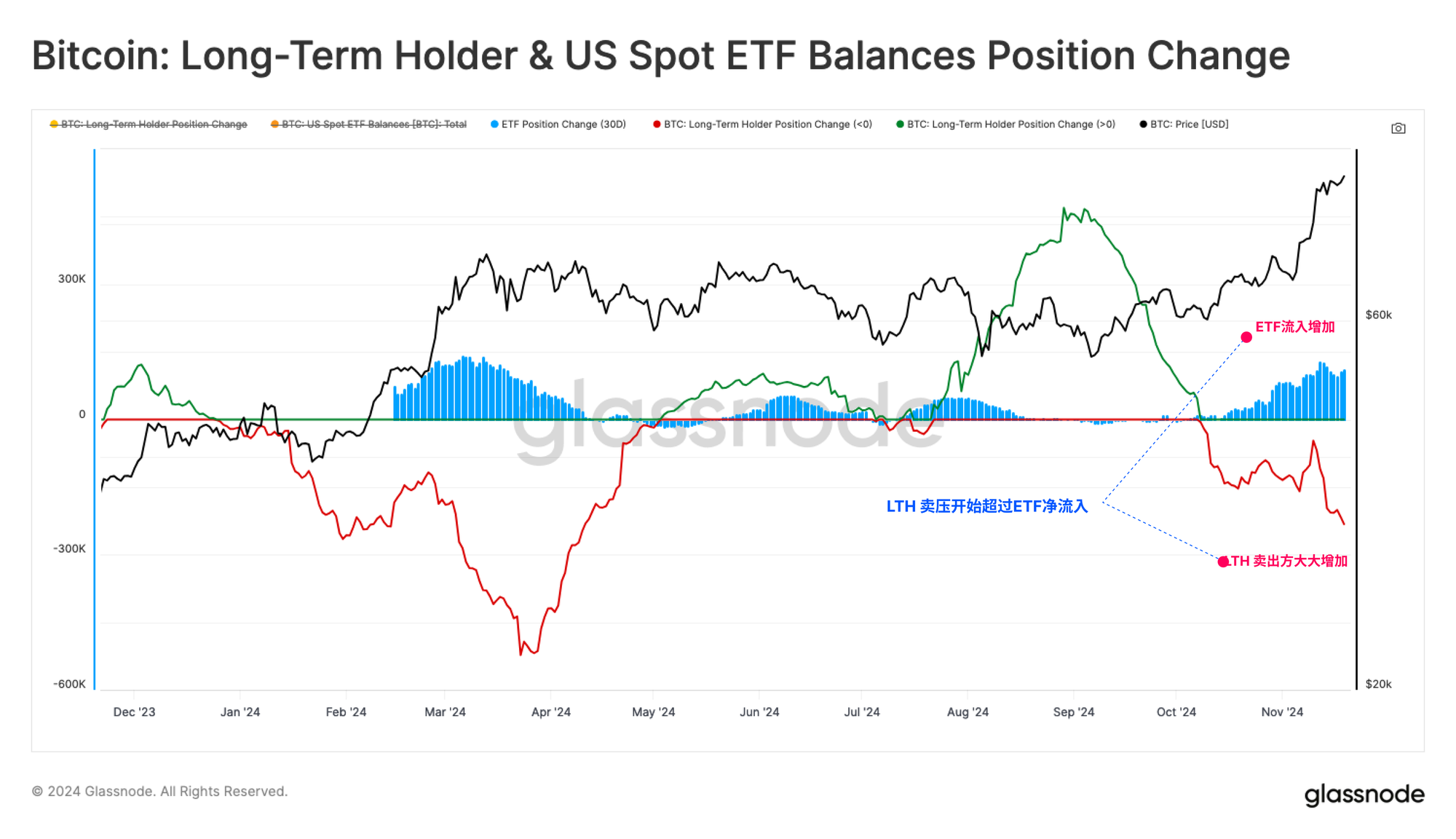 - 长期持有者未实现利润的增加引发了显著的抛售活动,从10月8日至11月13日,共有12.8万枚比特币被出售。