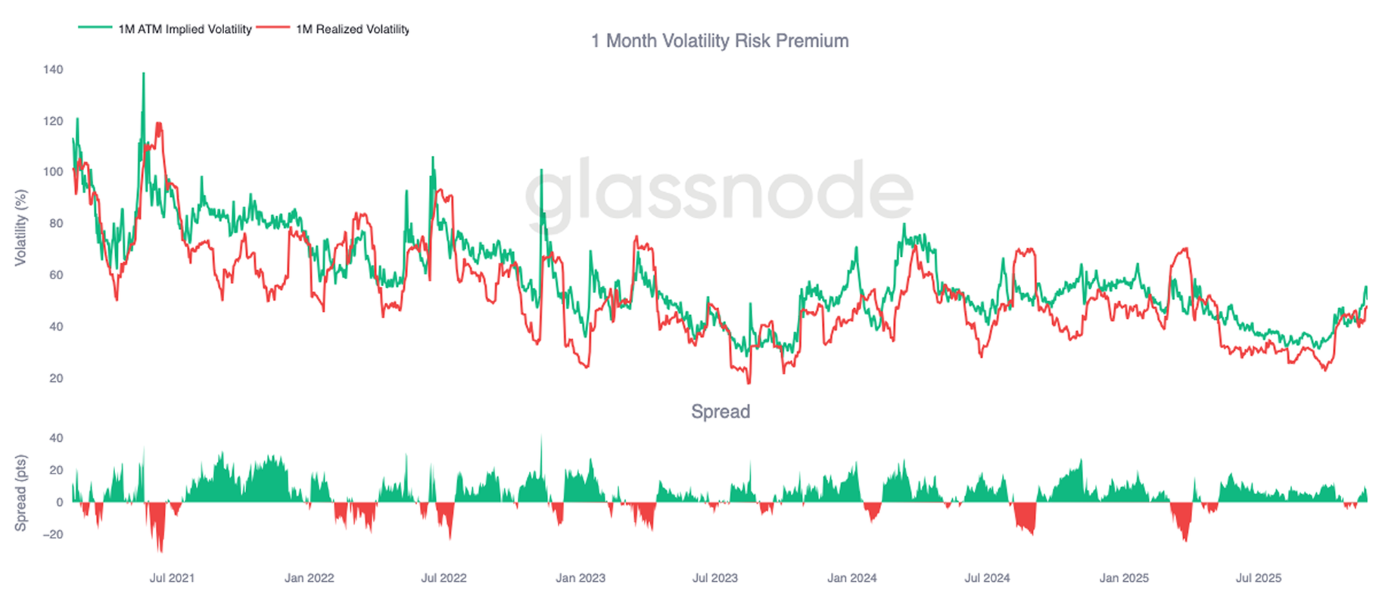 在偏斜变化之后,波动率本身也开始回归更典型的水平。近期走势显示出明显的均值回归迹象,表明波动率卖方正在重新入场,尽管隐含波动率仍高于市场近期的实际波动表现。即使短端隐含波动率较本周早些时候的峰值回落了约 20 个波动点、较近几日水平回落了约 10 个波动点,一个月期的隐含波动率依然处于高位。这一回调说明部分压力溢价正在被释放。