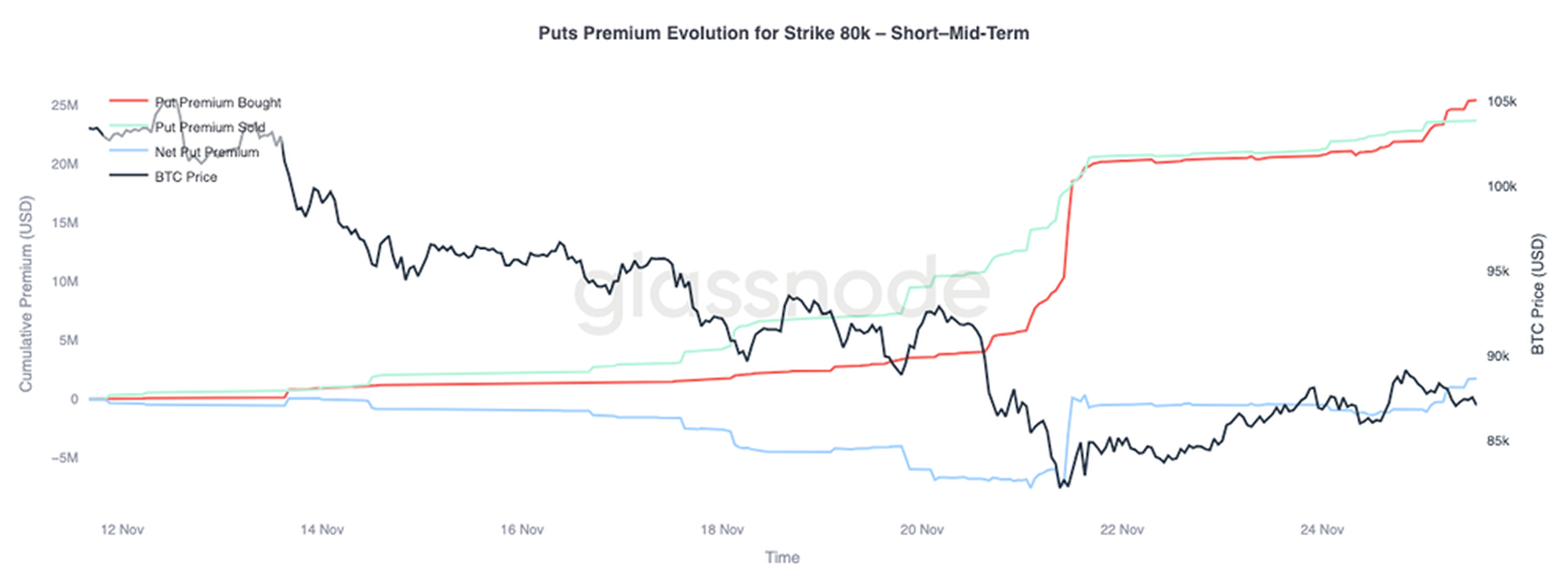 转向资金流动方面,围绕 80,000 美元看跌期权的活跃度清晰展现了短期和中期到期日下行保护需求的演变过程。过去四天,看跌期权的需求趋于平稳,这与价格自 80,500 美元附近反弹的走势相一致。这一平台期表明,短期对对冲需求的紧迫性已经有所缓解。此前在下跌期间观察到的下行保护需求激增,在市场开始反弹后并未持续。