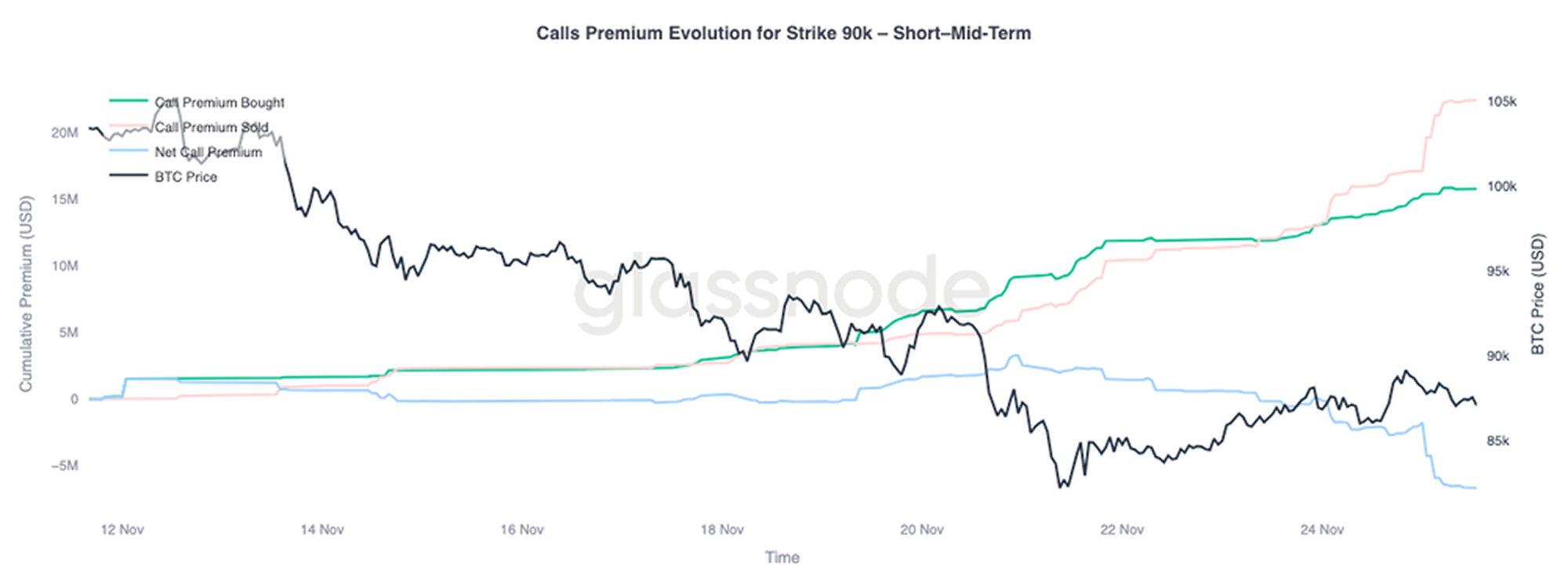 观察上行方向的资金流动则传达出一种相反的信息。尽管市场目前认为短期内崩盘的风险降低,但尚未对持续性反弹形成信心。市场更倾向于做空 90,000 美元的反弹尝试,而不是布局突破行情,这表明市场对反弹的信心依然有限。