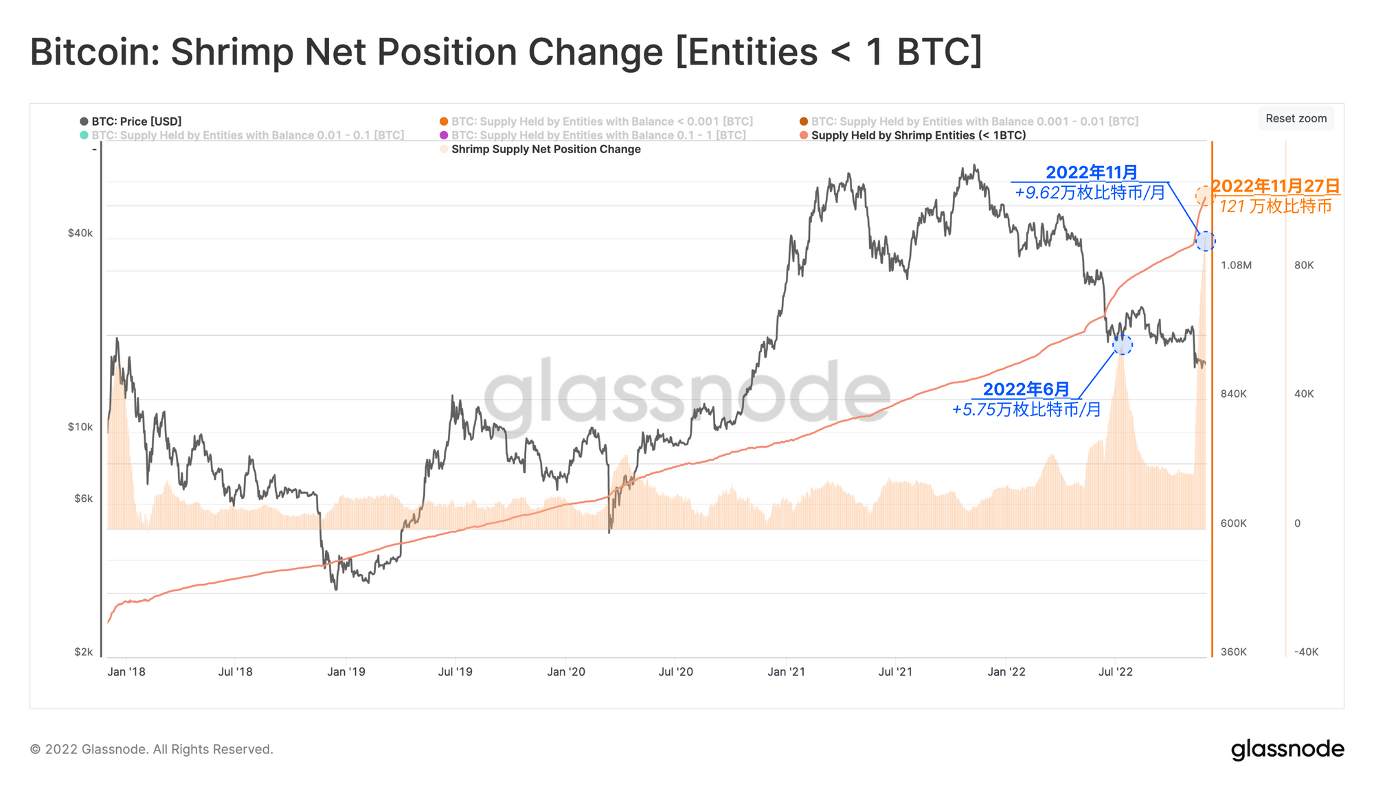 在所有群组中,持有的比特币小于1的实体(也被称为虾米🦐)在过去5个月中经历了两波独特的余额增加。自FTX崩溃以来,虾米们的持有量增加了9.62万枚比特币,现在持有超过121万枚比特币,相当于流通量的6.3%。