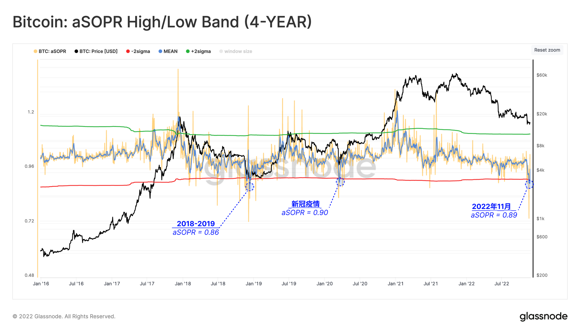 最近市场对FTX抛售的反应表现为aSOPR的值自2020年3月以来首次跌破低区间。这一事件的严重程度又只能与2022年3月新冠疫情的崩溃以及2018年12月的市场投降的幅度相提并论。