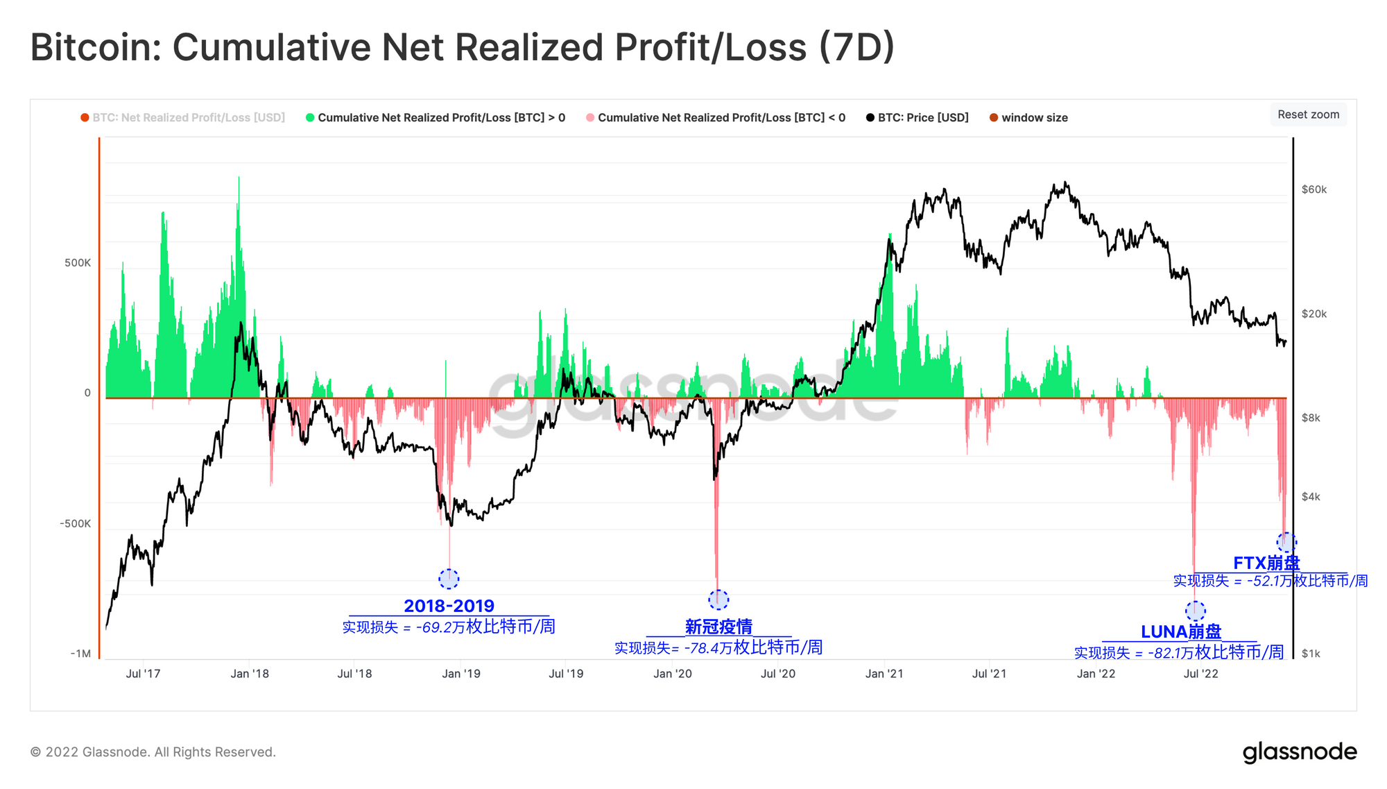 下面的图表显示了7天的累计实现净利润/亏损,以比特币为单位,以便在各周期之间进行比较。值得注意的是,在上周,市场实现了相当于-52.1万枚比特币的净损失,这再次接近了历史上的最大记录。
