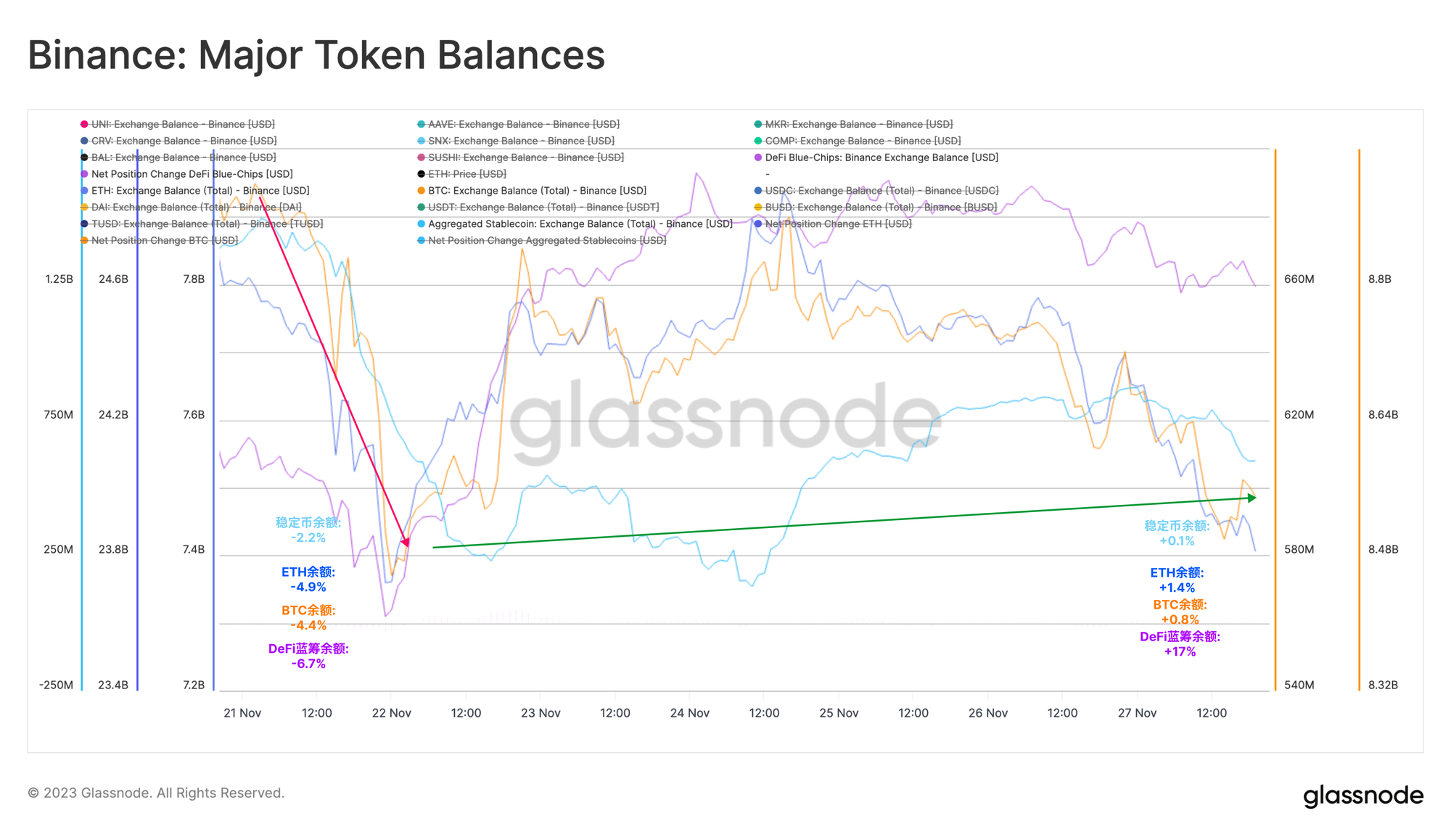 这一消息传出后,Binance交易所主要资产的提现活动有所上升。在最初的24小时内,一系列DeFi"蓝筹股 "的总余额下降了-6.7%,而BTC、ETH 和稳定币的余额分别下降了-4.4%、-4.9% 和-2.2%。