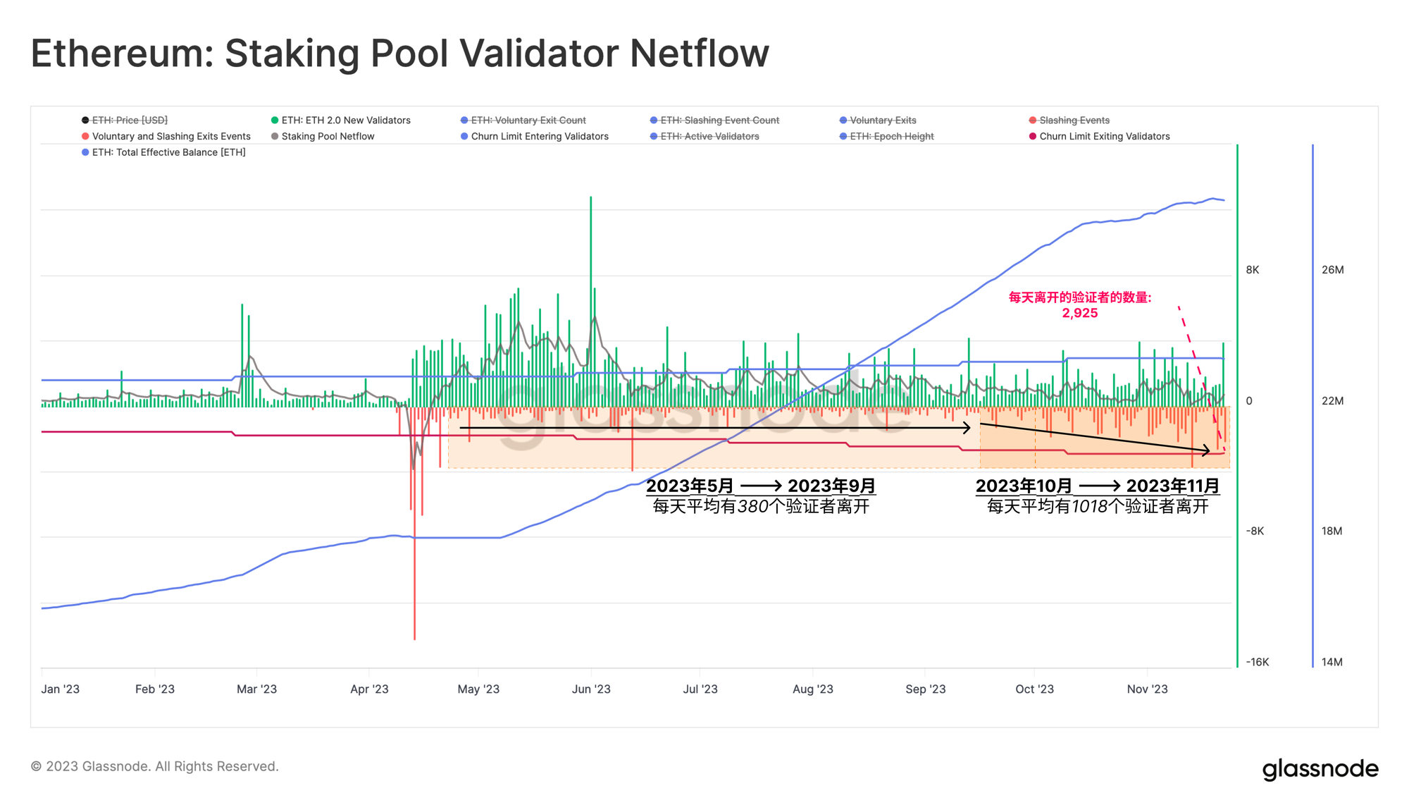 自10月初以来,退出事件逐渐增多,平均每天有1018个验证者退出。这种上升趋势与近期数字资产市场现货价格的上升趋势相吻合。