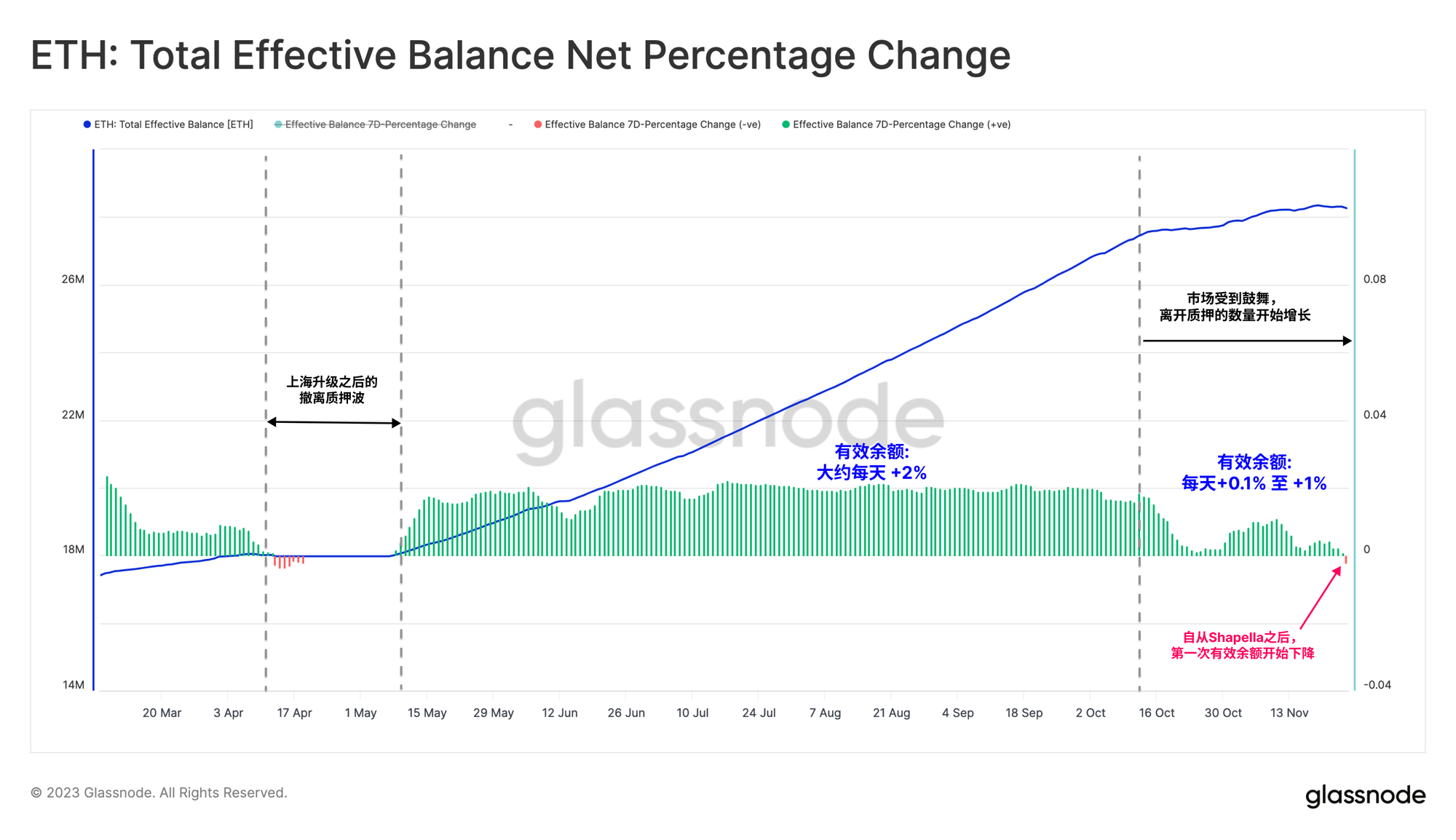 因此,总有效余额(代表质押池中积极参与 “权益验证"的 ETH)的增长速度已经放缓,目前正经历自上海升级以来的首次下降。