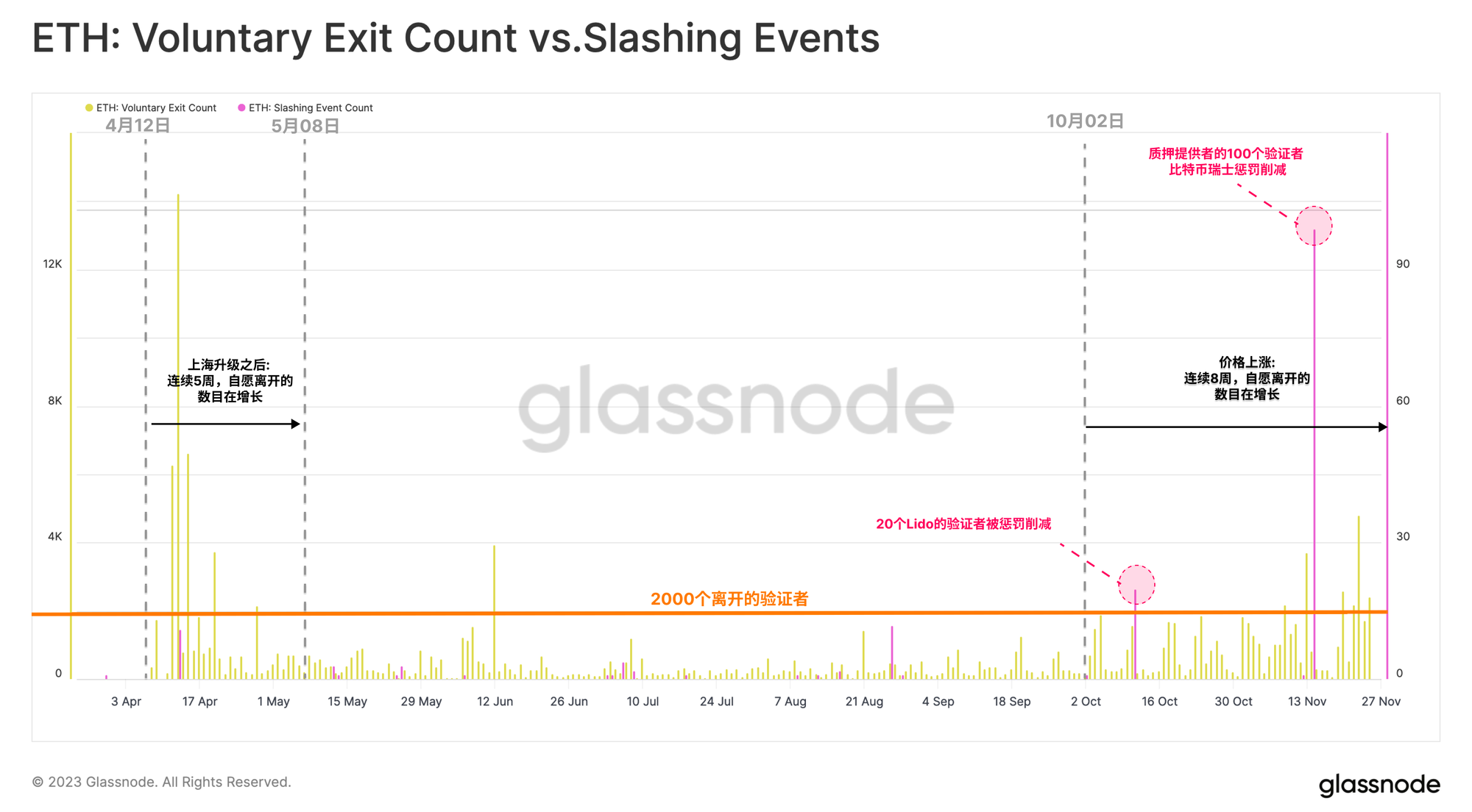 仔细观察退出验证者的情况,我们可以发现,这在很大程度上是由过去八周的自愿退出所驱动的。自愿退出是指验证者自主选择退出质押池。这有别于惩罚性削减(slashing),后者是对违反协议规则的验证者实施的惩罚。