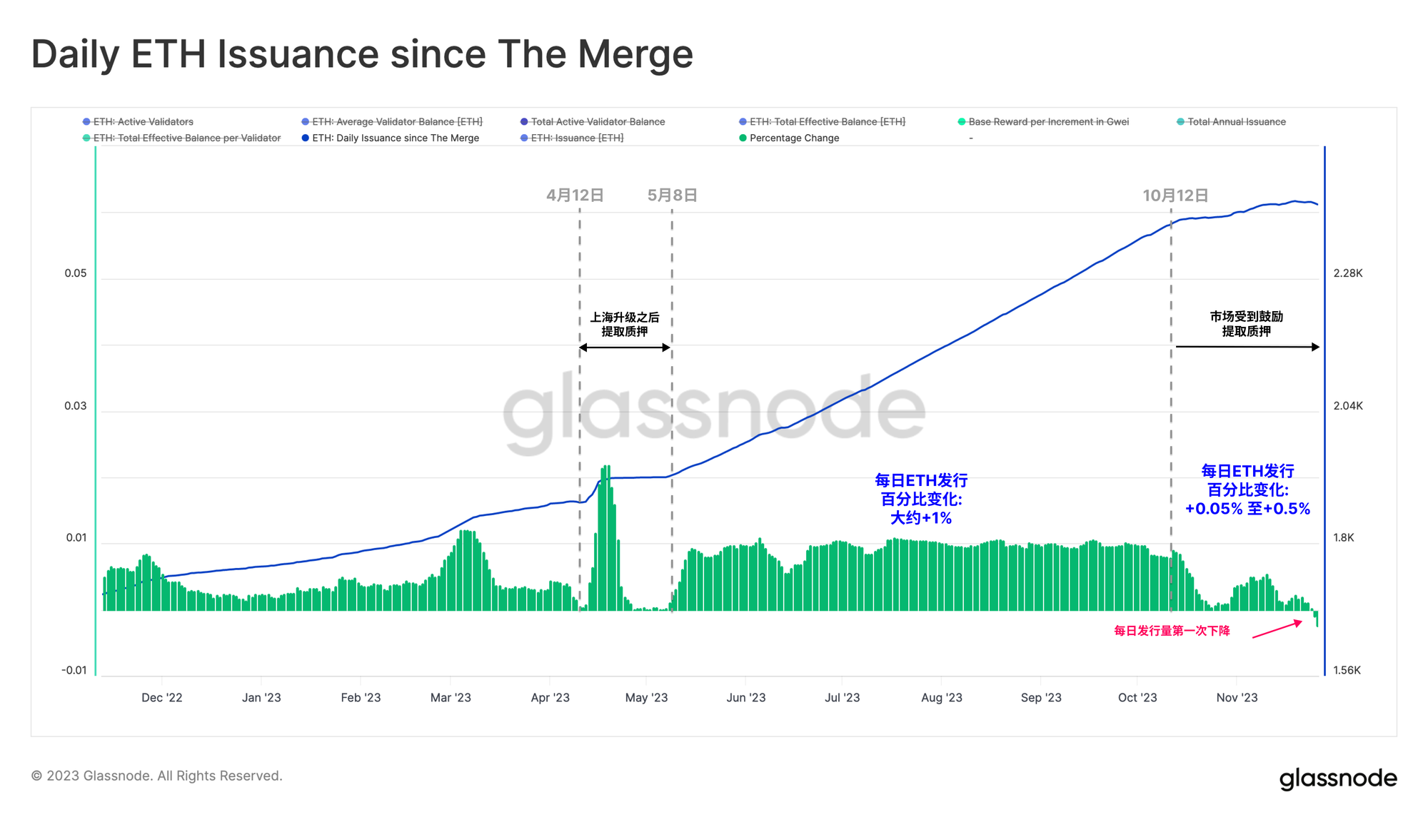 - 验证者退出数量的增加导致了ETH日发行量的下降,而ETH日发行量与质押池中的活跃ETH数量有关。