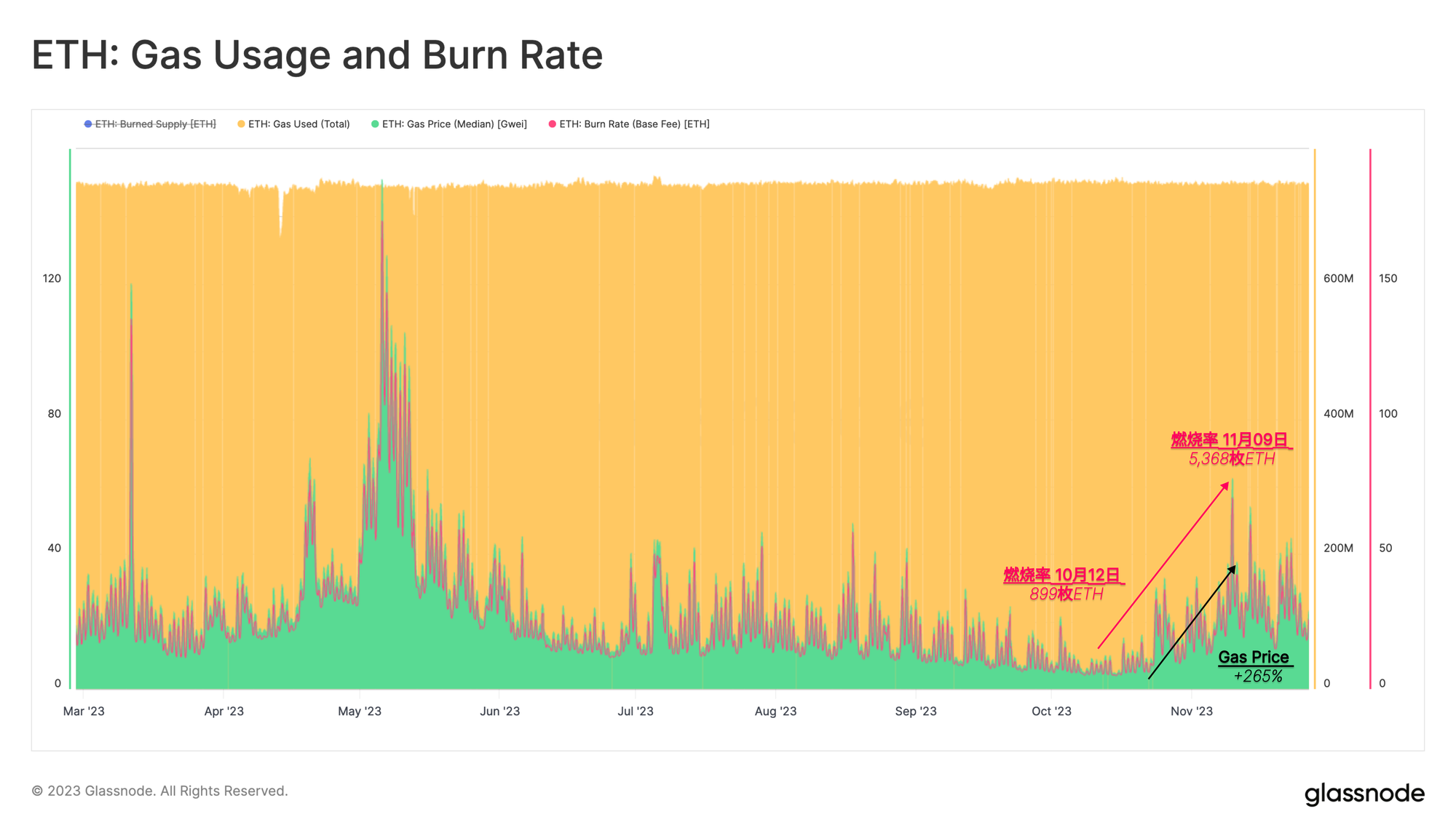 随着gas价格的上涨(这意味着以太坊网络上的交易需求不断增长),每天烧掉的ETH费用也在增加。10月份,我们观察到每天烧掉的ETH费用达到899枚ETH。快进近一个月后,累计烧掉的费用现已达到5,368枚ETH。