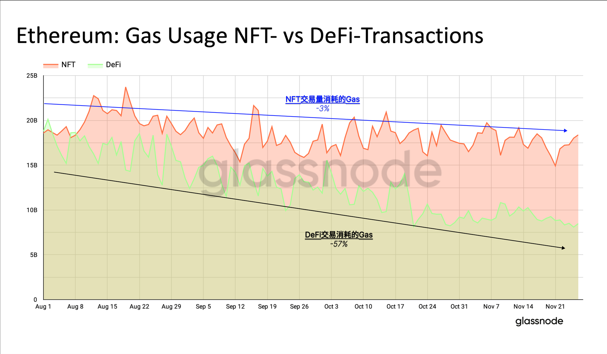 通过研究历史上推动以太坊网络采用的两个领域,我们可以发现,在过去四个月中,NFT 交易和DeFi交易的贡献相对较小,分别下降了-3%和-57%。这两个领域的采用率都在下降,对链上活动的最新激增贡献甚微。