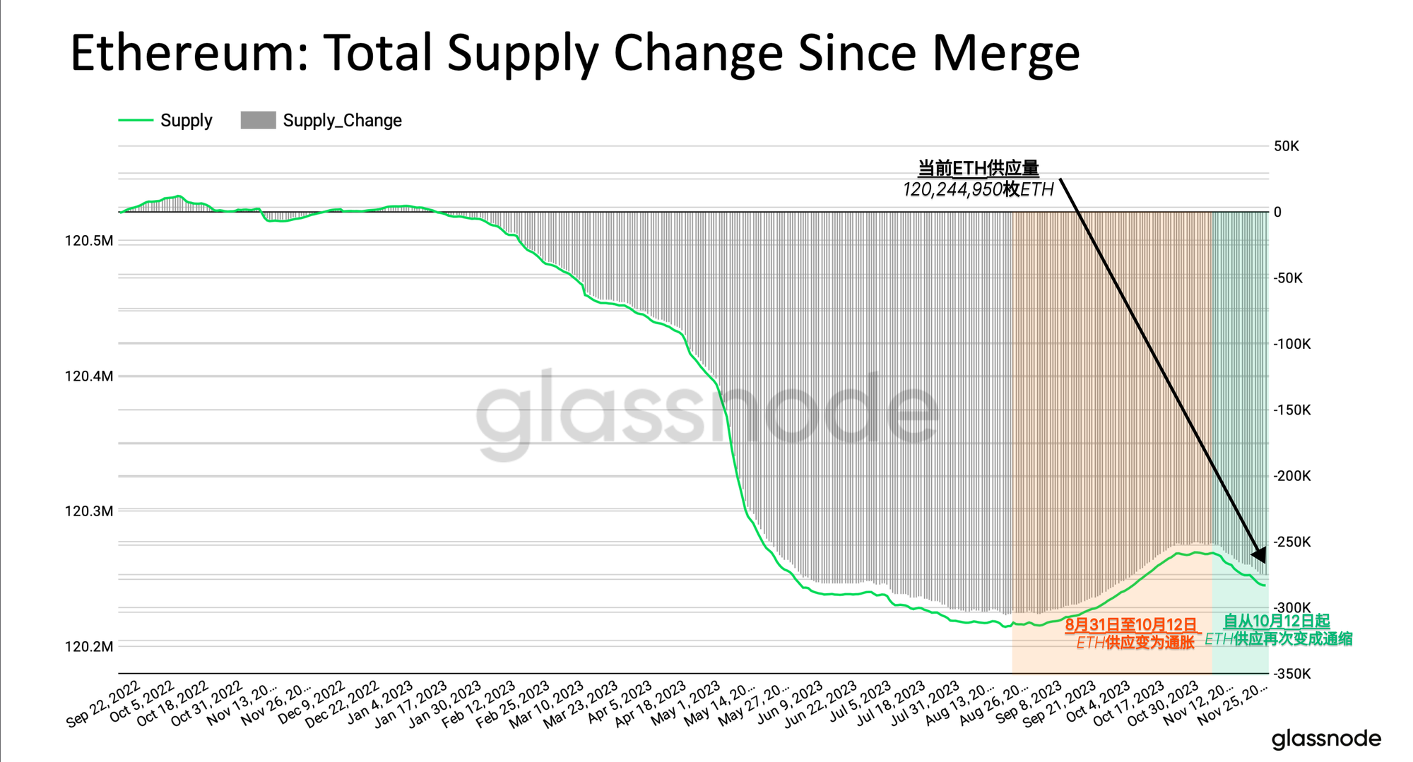 最近几周,由于发行率下降和供应量增加,ETH总供应量再次转为净通货紧缩。