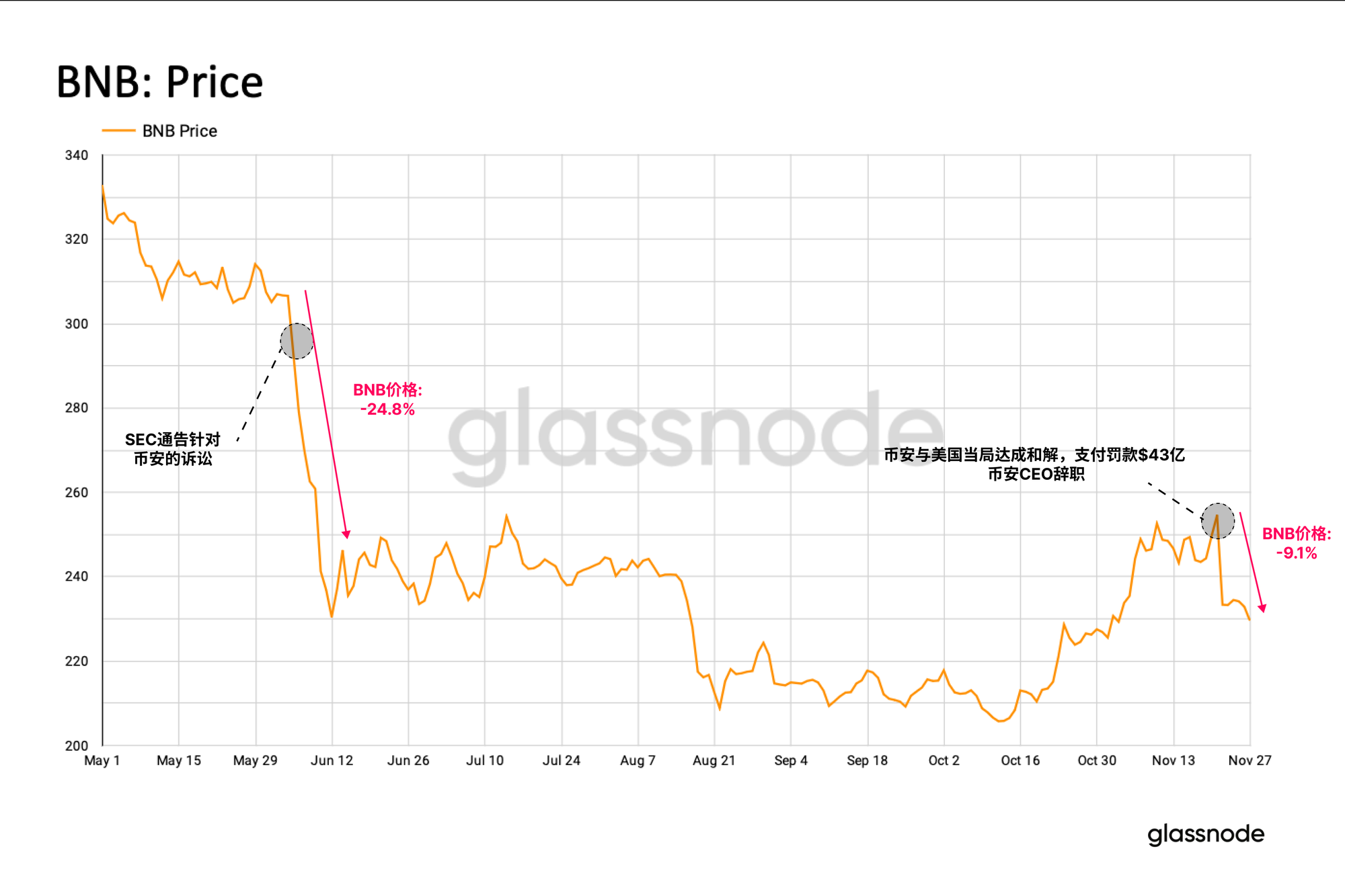 消息公布后,BNB 的价格下跌了-9.1%。不过,与之前的价格下跌相比,这一市场反应相对温和,比如今年早些时候美国证券交易委员会宣布指控时,BNB的价格下跌了24%。