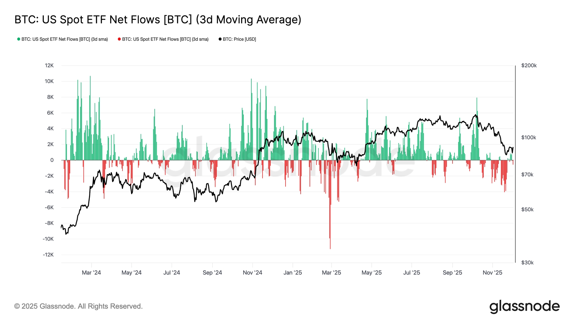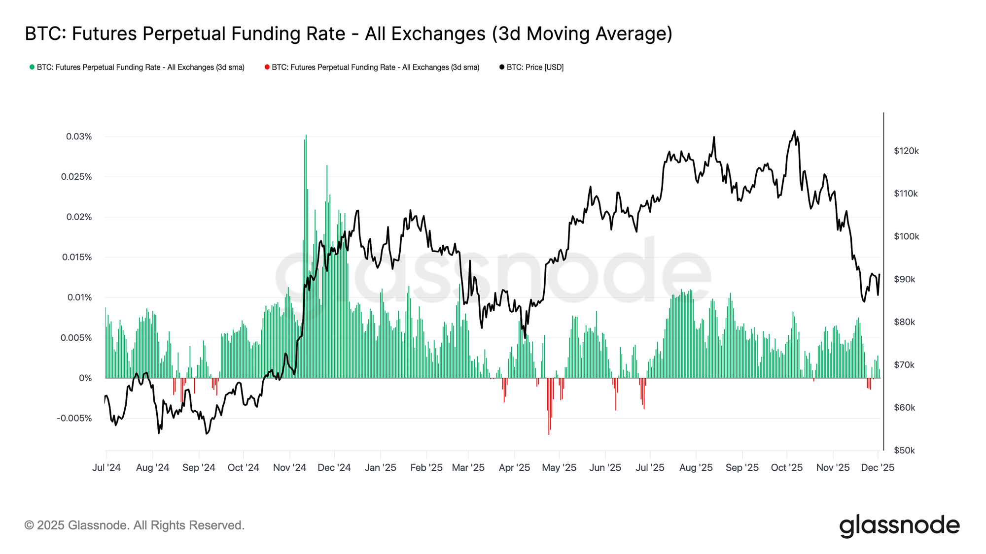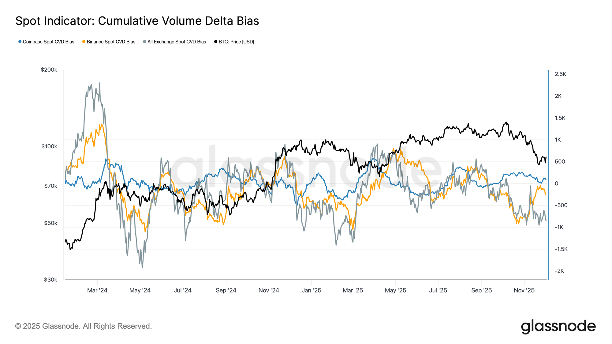 随着未平仓合约持续收缩,永续合约的资金费率已回落至整体中性水平,在11月下旬大部分时间围绕零轴波动。这与前期扩张阶段出现的高位正资金费率形成明显对比,表明多头杠杆仓位已大体出清。值得注意的是,轻微负值的资金费率阶段往往较浅且持续时间短,说明即使在价格回落期间,交易者也并未大规模偏向空头。