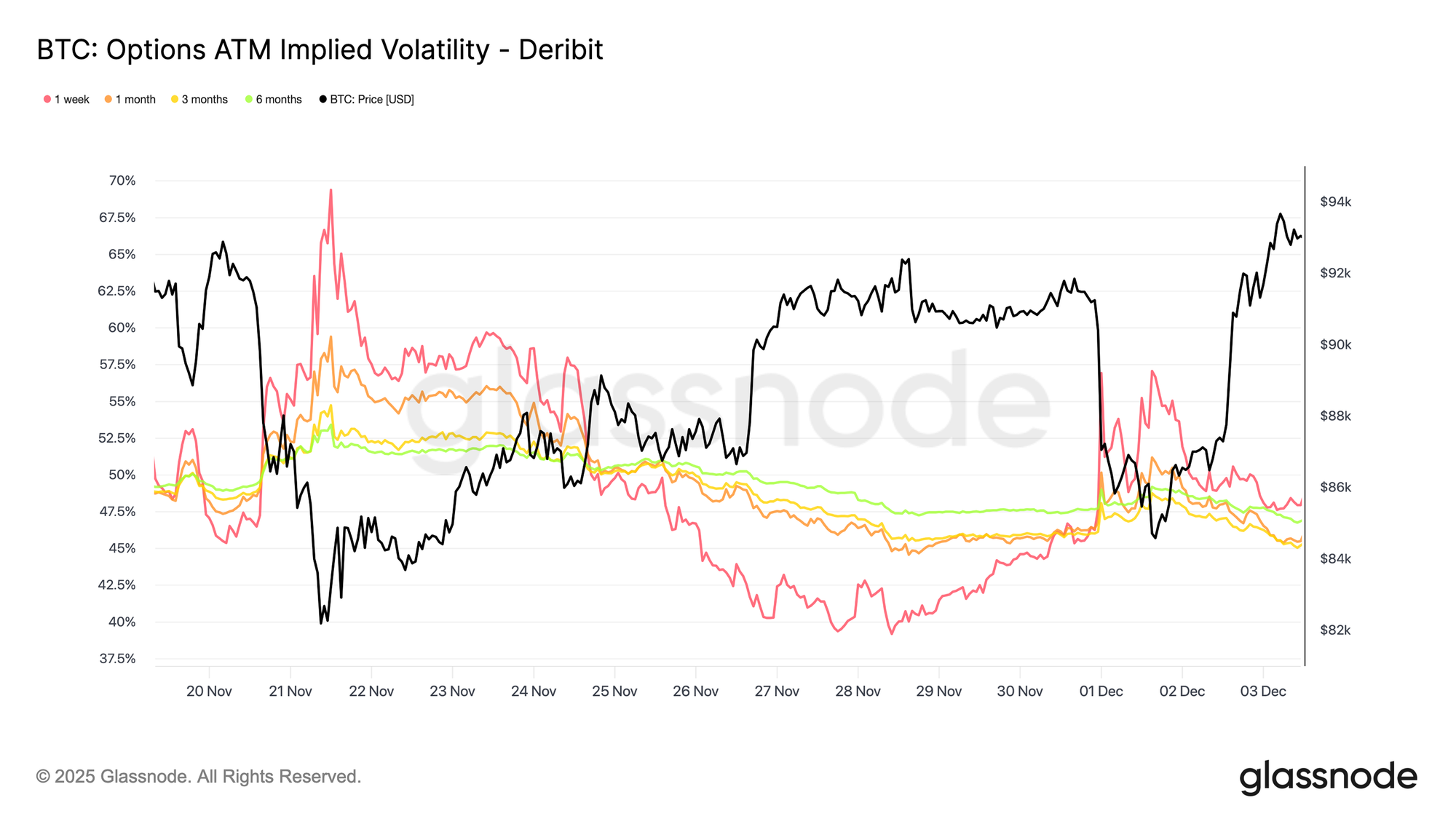 转向期权市场,隐含波动率为我们提供了观察交易者如何定价未来不确定性的清晰视角。首先,追踪隐含波动率是有价值的,因为它反映了市场对未来价格波动的预期。继上周出现较高读数后,隐含波动率现已回落至较低水平。价格一直难以突破92,000美元阻力位,反弹缺乏持续性促使波动率卖方重新入场,导致各期限的隐含波动率普遍下行。