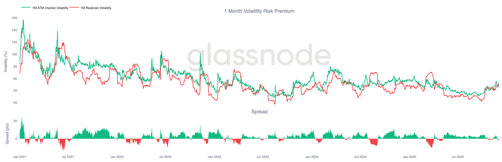 链下指标进一步强化了当前的防御基调。ETF资金流转为负值,现货成交量差(CVD)出现回落,期货未平仓合约正在稳步去杠杆化。资金费率接近中性,既不显示出多头信心,也没有强烈空头压力。在期权市场中,隐含波动率已被压缩,波动率倾斜减弱,资金流向发生逆转,且期权价格相对于实际波动率被低估,显示市场更倾向于谨慎,而非重燃的风险偏好。