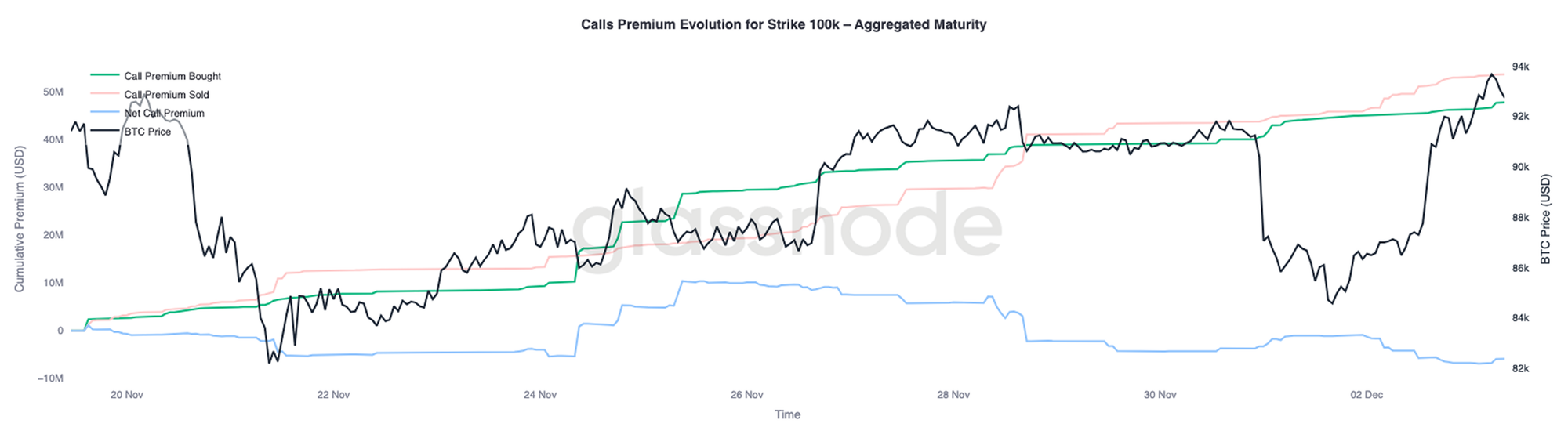 聚焦于10万美元执行价的看涨期权溢价,有助于厘清交易者如何应对这一关键心理关口。在图表右侧,可以看到卖出看涨期权的溢价始终高于买入看涨期权的溢价,且在过去48小时的反弹中,两者之间的差距进一步拉大。这一差距扩大表明,市场对重新站上10万美元的信心仍然有限。该水平很可能面临阻力,尤其是在价格上涨过程中隐含波动率压缩、下跌时则重建的背景下。这一模式强化了当前区间内隐含波动率的均值回归特性。