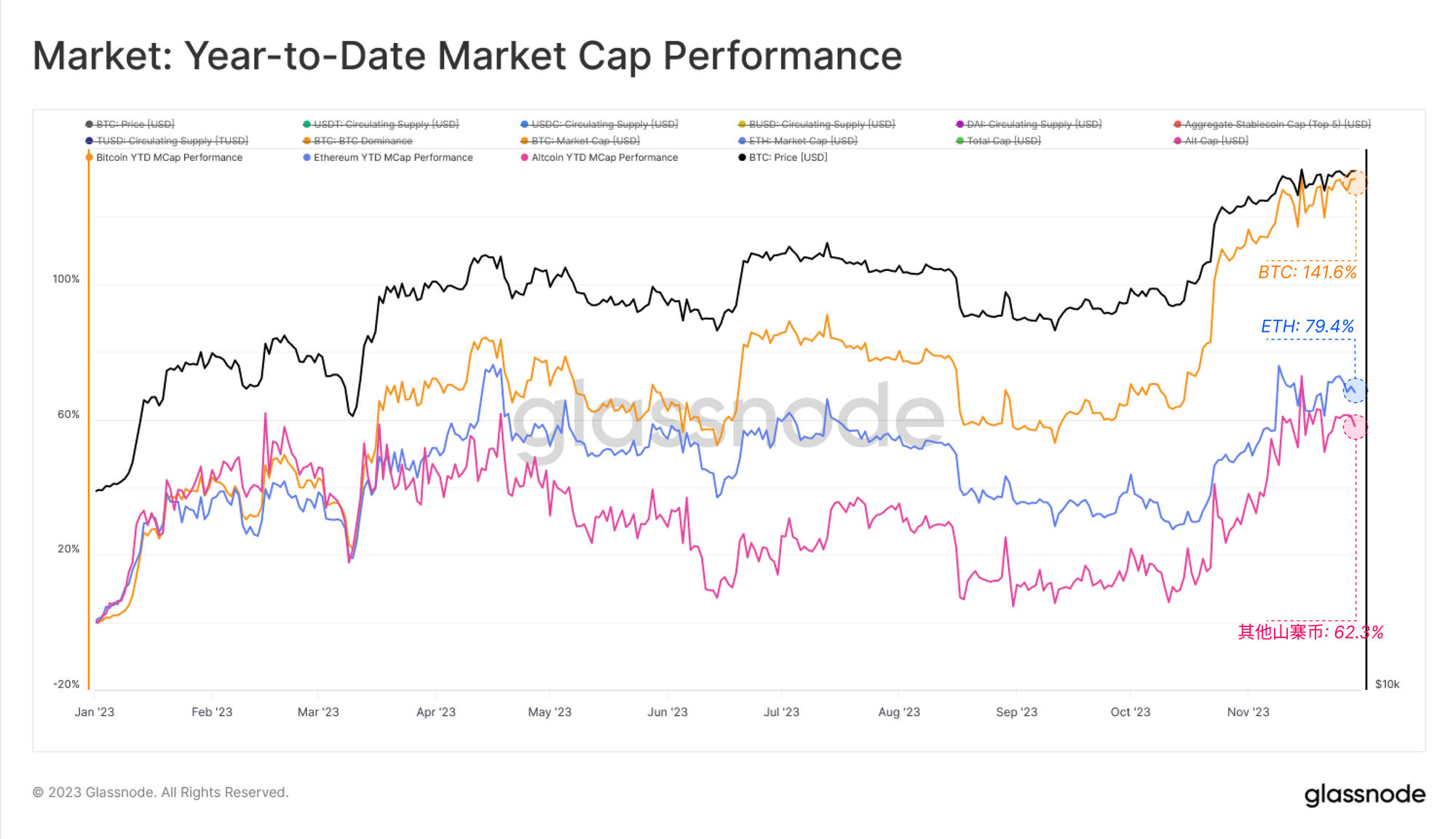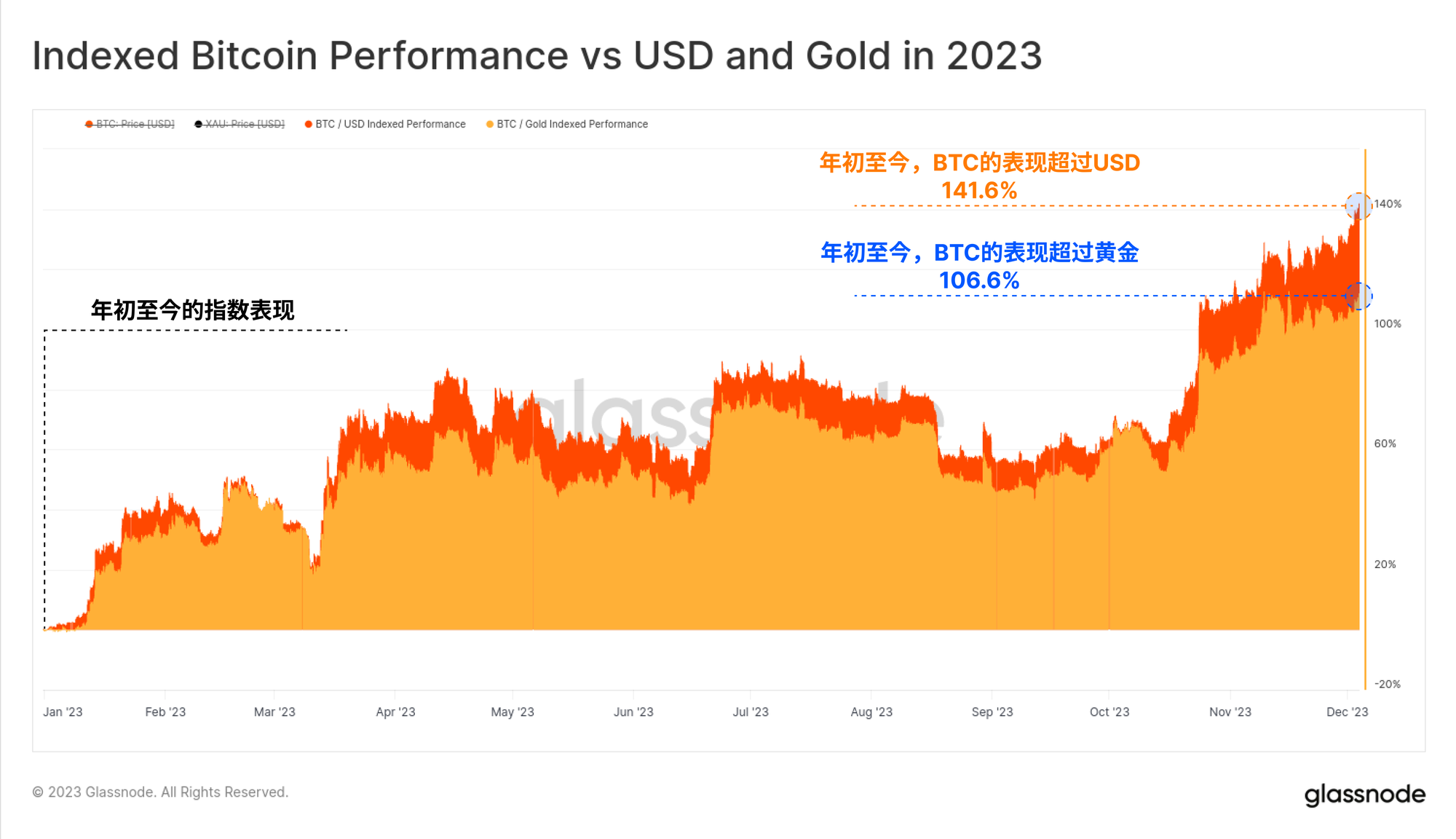 比特币在12月初突破了4万美元的大关,再次提醒我们2023年对这种资产来说有多么不同寻常。在本周的版本中,我们将比较比特币在2023年以及过去周期中相对于其他资产的表现。我们还将评估与投资者对市场又一强劲周的反应相关的链上指标。