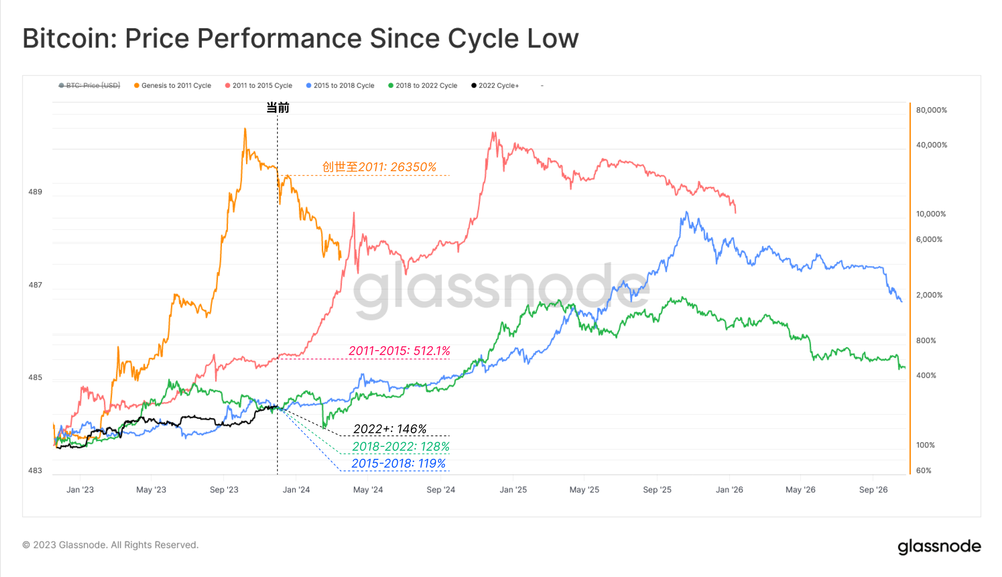 如果我们从相反的极端,即周期低点来评估周期性能,我们会发现与2015-18和2018-22周期相似的比较点。自2022年11月FTX设定的最低点以来,BTC价格已上涨+146%,这是过去两个周期中最强的1年回报率。总体表现在相同的恢复期内,仍然非常符合过去的周期。