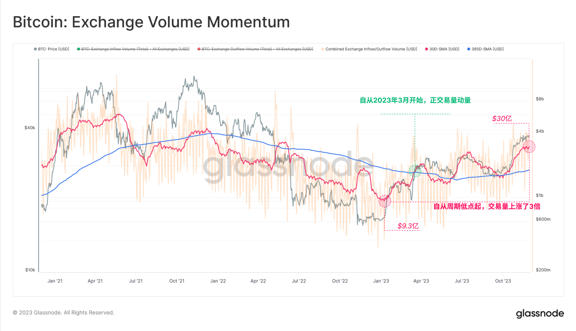 从链上交易量领域来看,我们可以看到,年初至今流入和流出交易所的交易量已从9.3亿美元增长到超过30亿美元(增长220%)。这凸显了投资者对交易、积累、投机以及利用交易所提供的服务的兴趣不断扩大。