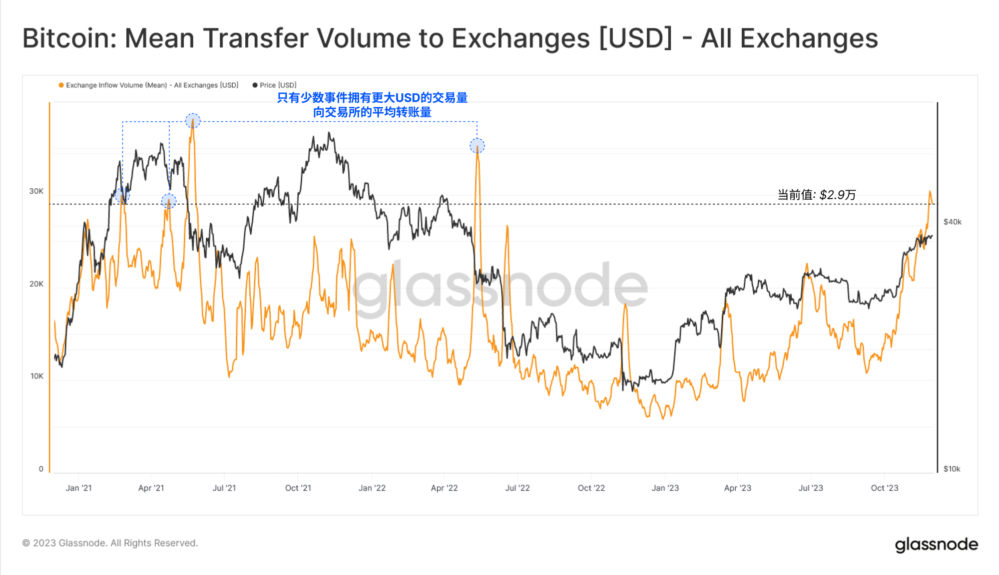 随着交易所交易量的大幅上涨,对交易所存款平均规模的分析出现了一个有趣的观察点。这个指标经历了一次非同小可的上涨,接近之前每笔存款3万美元的历史最高点。