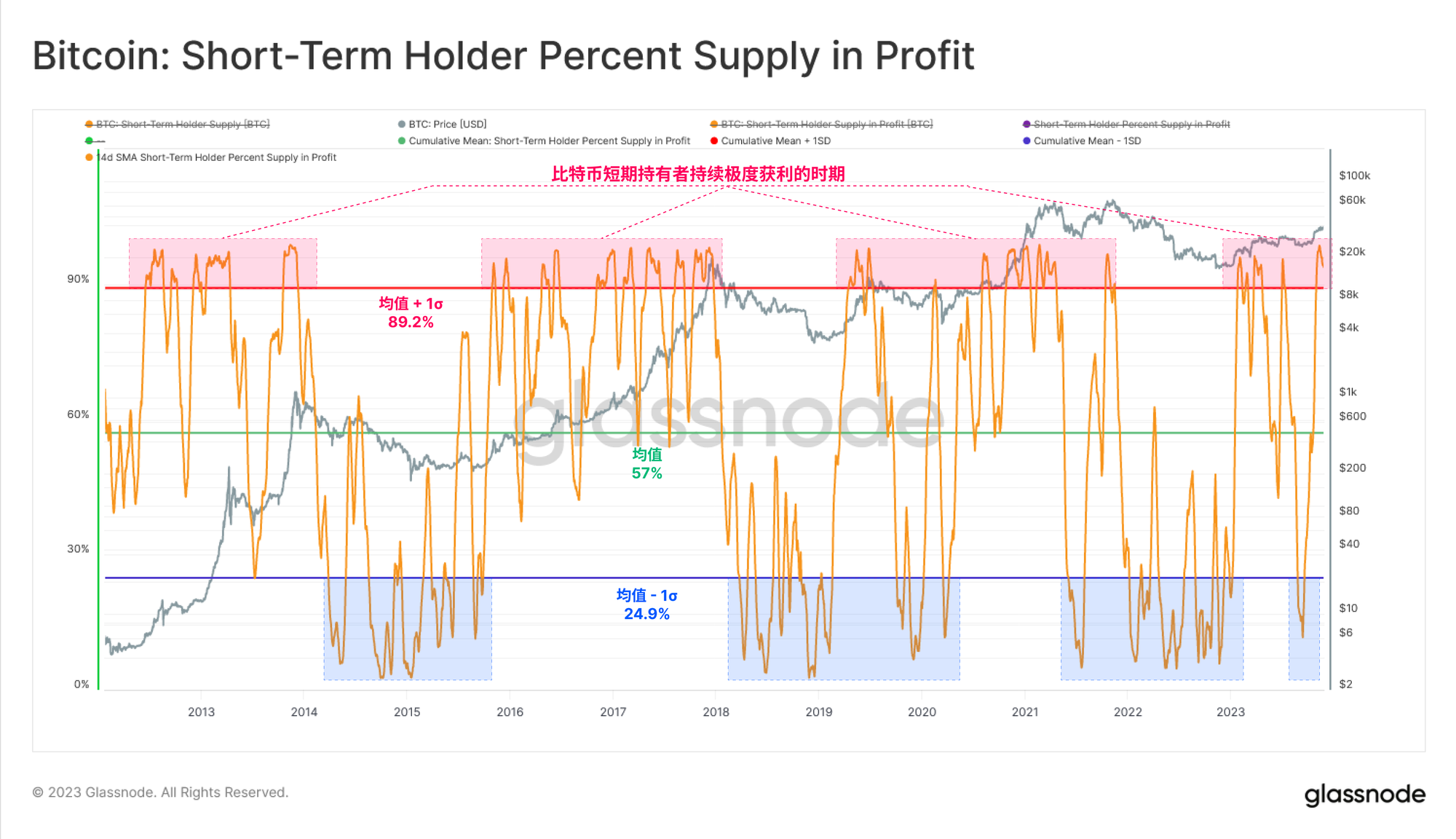 短期持有者几乎完全盈利,超过95%的持有量成本基础低于当前现货价格。这个读数超过了这个指标的长期+1标准偏差水平,并且再次与历史上的热情上升趋势相关联。