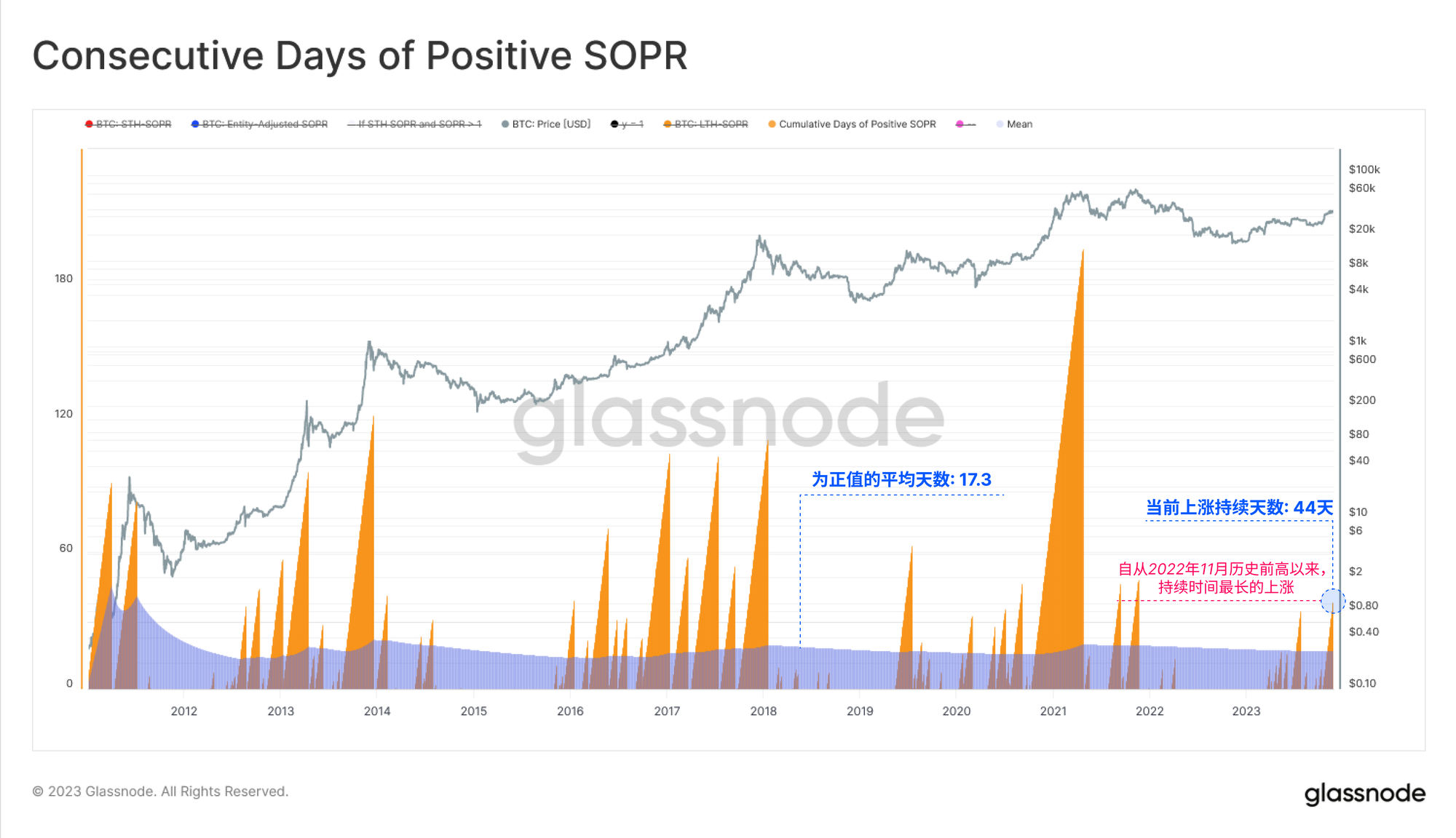 我们可以通过监控连续几天三种 SOPR 变体都在 1.0 以上交易的天数来拓展这一洞察。目前的涨势已持续了44天,这比平均持续时间17天更长,也是自2021年11月历史最高点以来最长的一次。