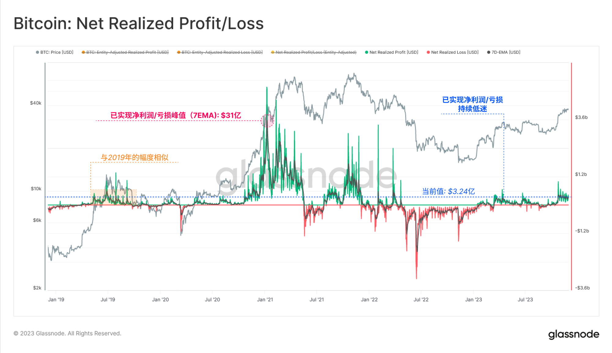 市场锁定的净美元计价实现盈利已达到每天3.24亿美元,但仍远低于2021年牛市后期经历的高峰(超过每天30亿美元)。
