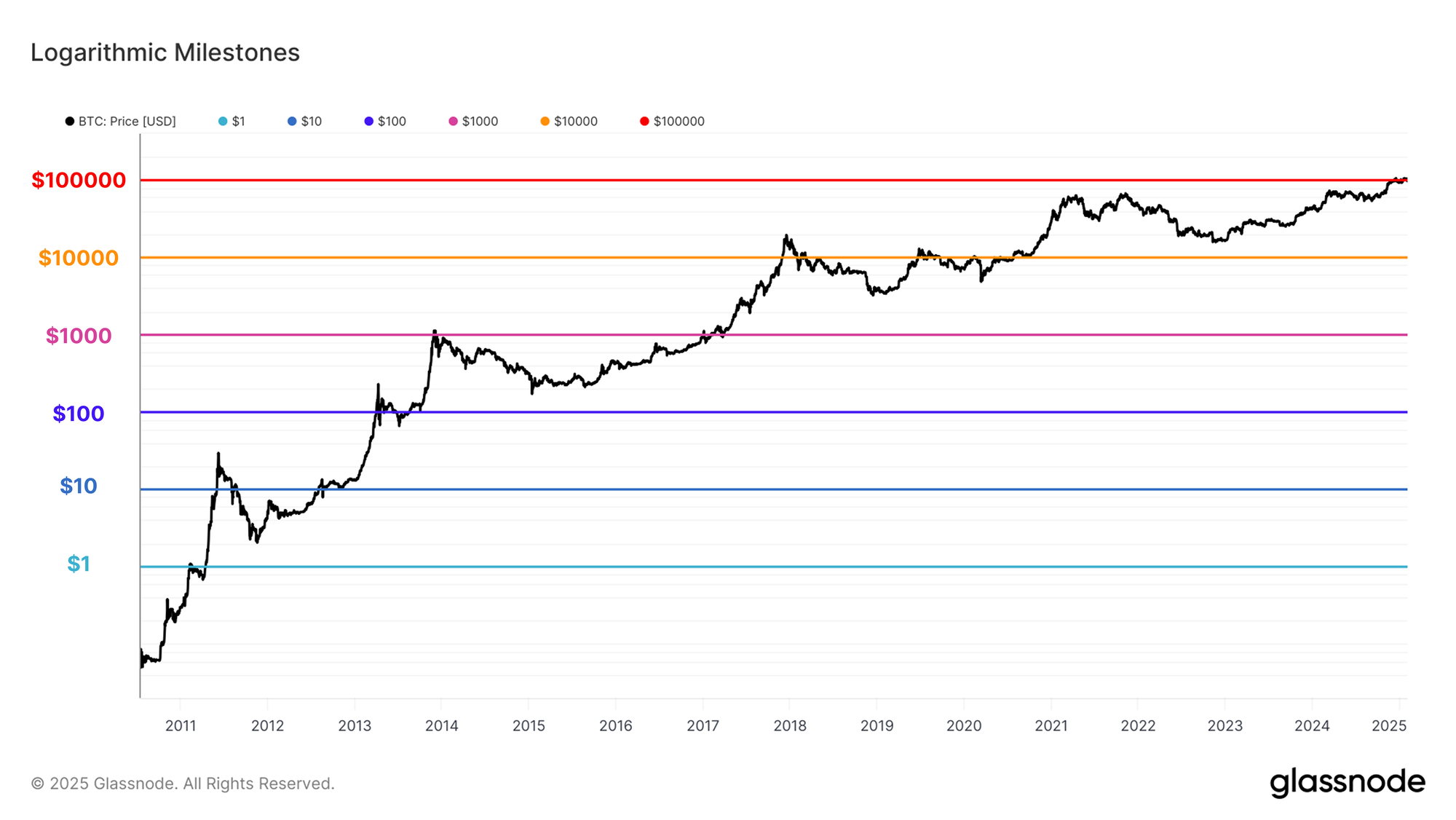比特币已经连续数周保持在心理上重要的$10万关口之上,这一成就曾被许多批评者认为不可能实现。这一突破是在比特币上一次突破$1万这一对数级里程碑的7年后达成的,当时正值2017年的牛市。