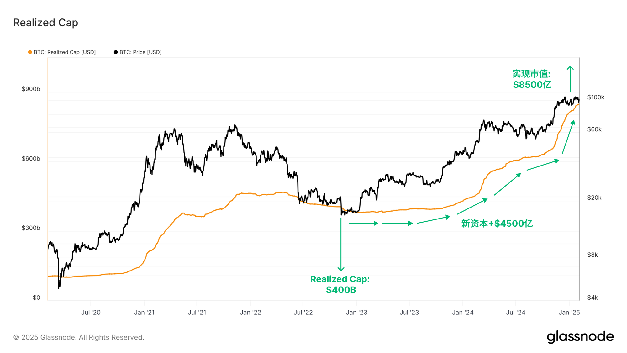 这反映出比特币中累积存储的“价值”约为 $8500亿,每枚比特币的定价基于其最近一次在链上交易的时间点。