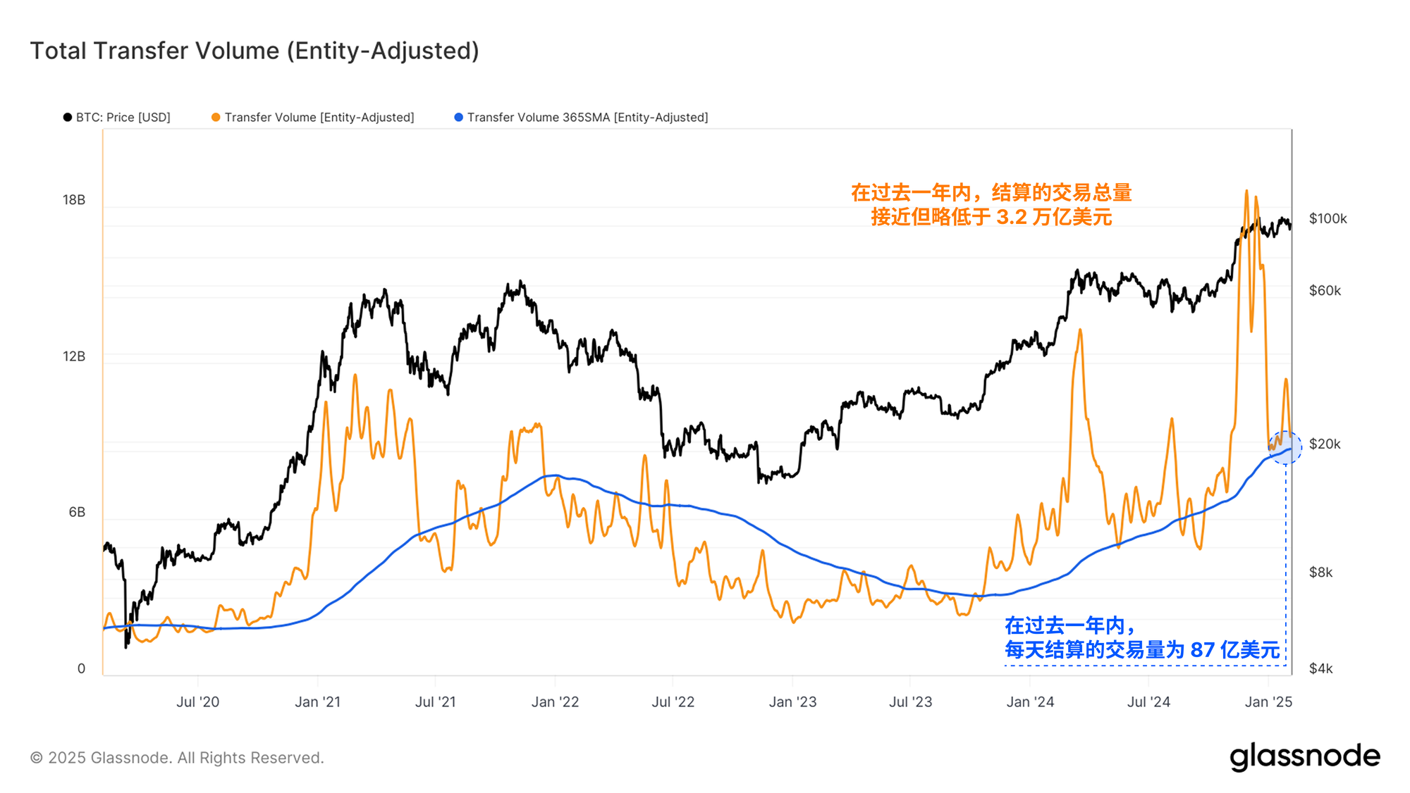 当使用Glassnode的实体调整启发法来筛选仅包含经济交易时,在过去365天内,比特币网络平均每日处理87亿美元的交易,总转移价值在过去一年内达到3.2万亿美元。