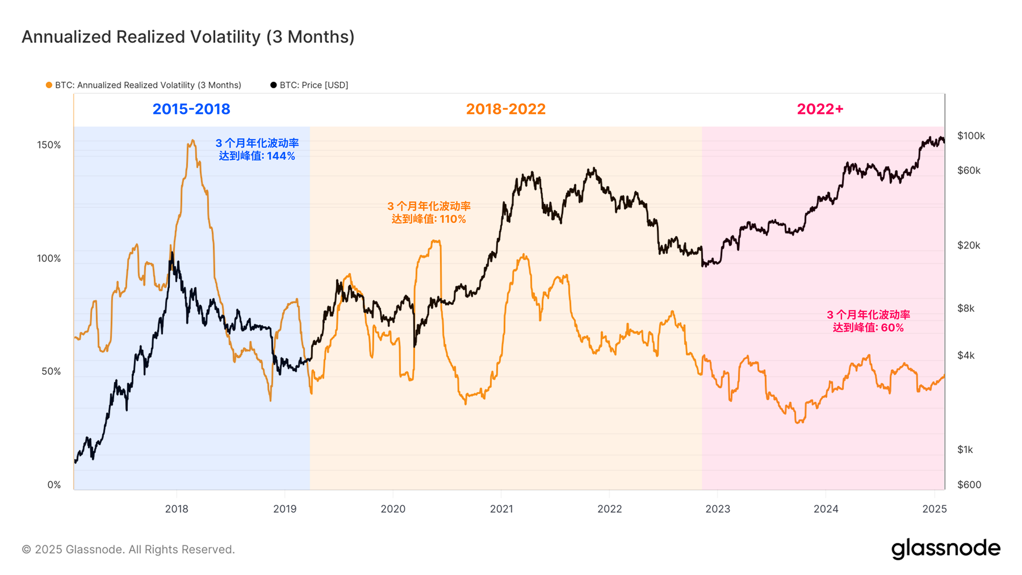 数字资产生态系统的最新监管变化推动了投资者结构的演变,使得比特币市场中成熟的机构投资者占比提升。这一更具耐心、韧性更强且对价格波动不敏感的投资者群体,促使市场回撤幅度缩小,波动性逐步下降。