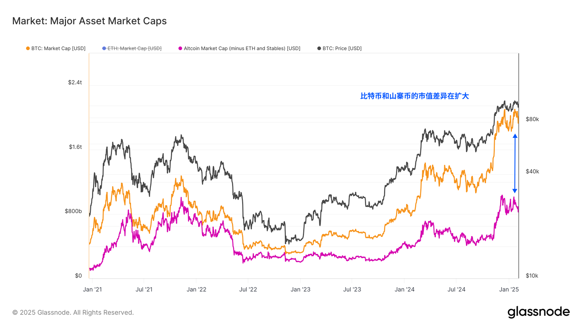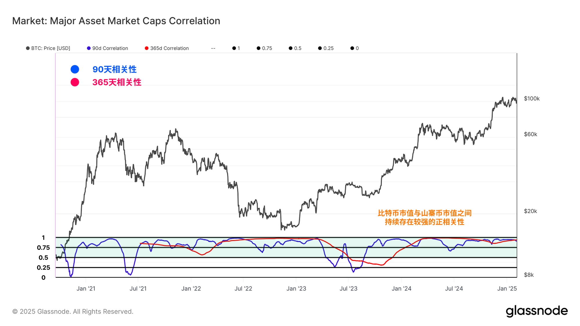 尽管比特币和山寨币的市值增长存在差异,但两者之间的相关性依然稳固。这表明造成这种分化的主要驱动因素并非两者增长率的不同,而是进入比特币市场的资本量相较于山寨币市场的显著差异。