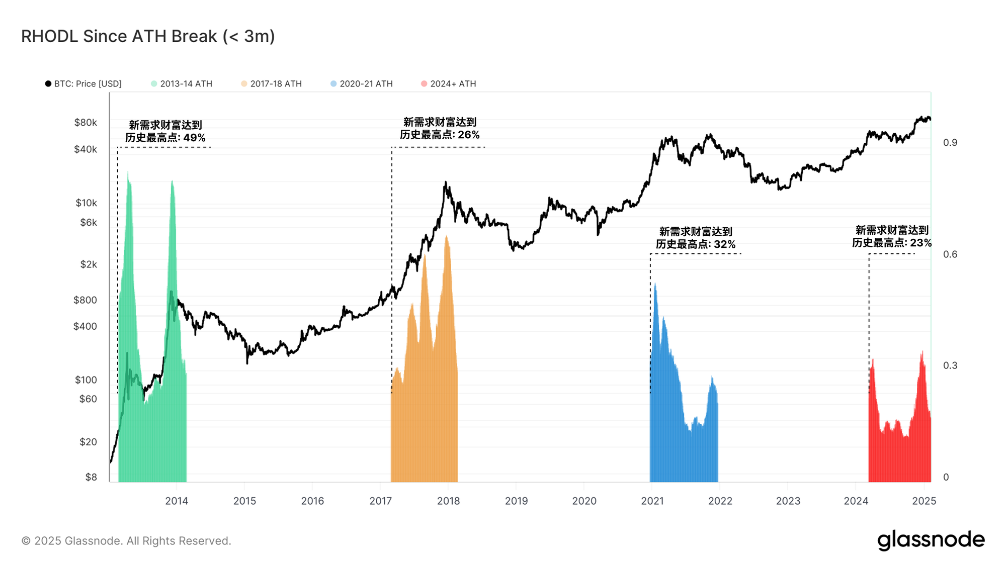 尽管本轮周期的新需求具有一定的影响力,但持有时间不足3个月的比特币财富占比,仍明显低于以往周期。这表明本轮周期的新需求资金流入量不及往期,并且呈现出短暂爆发和高峰,而非持续性的资金流入。